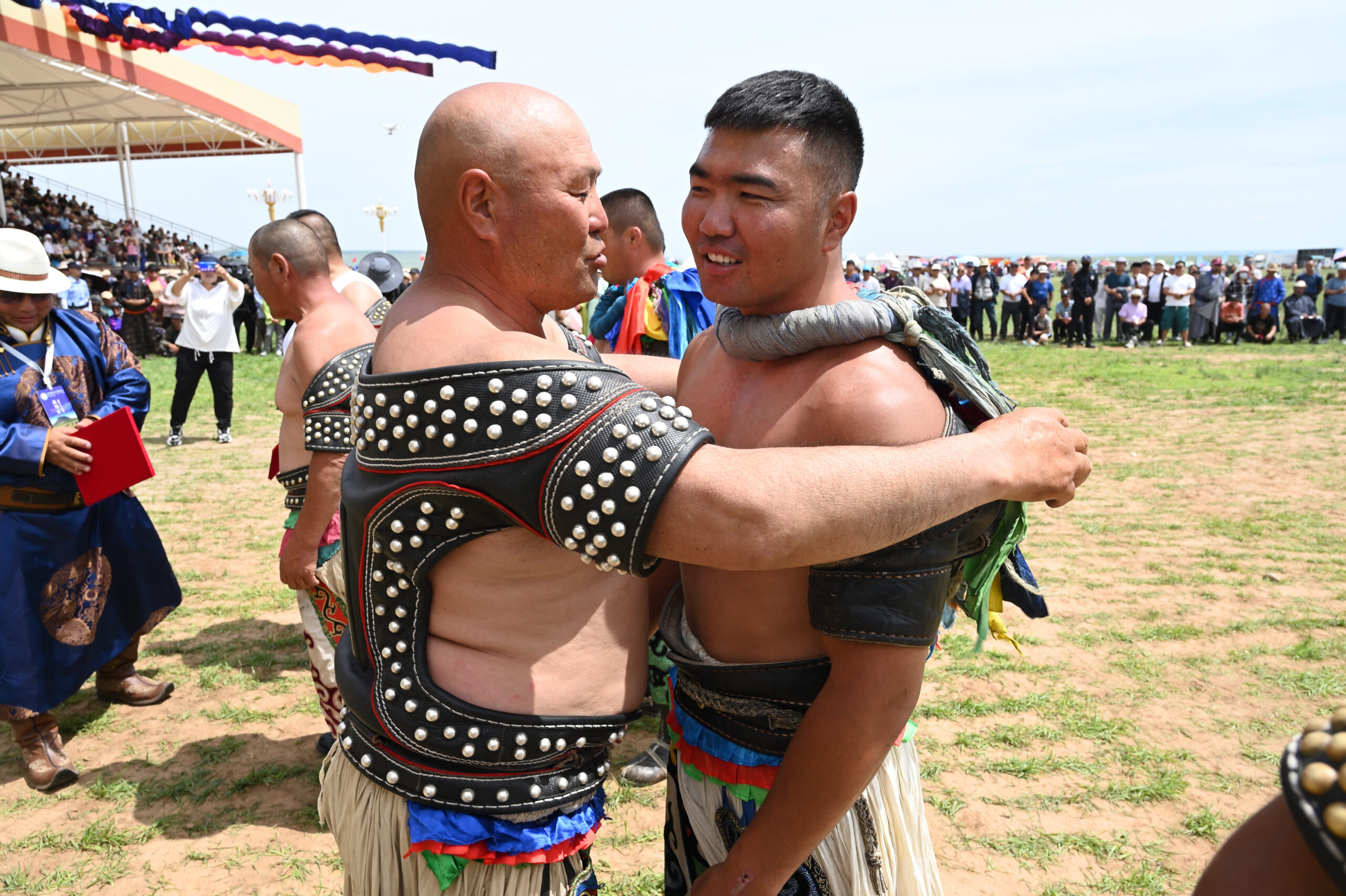7月26日,内蒙古锡林郭勒盟,前辈搏克手把将嘎传授给后辈。当日,阿巴嘎旗第八届人民那达慕大会在内蒙古锡林郭勒盟阿巴嘎旗开幕,会上举行将嘎授勋仪式,致敬10位前辈搏克手。据悉,搏克手脖子佩戴的五色彩条项圈叫做将嘎,搏克手只有在竞技场上取得一定成绩后才有资格佩戴。仪式中,前辈搏克手把将嘎传授后辈之后,自此再不踏上搏克竞技场。