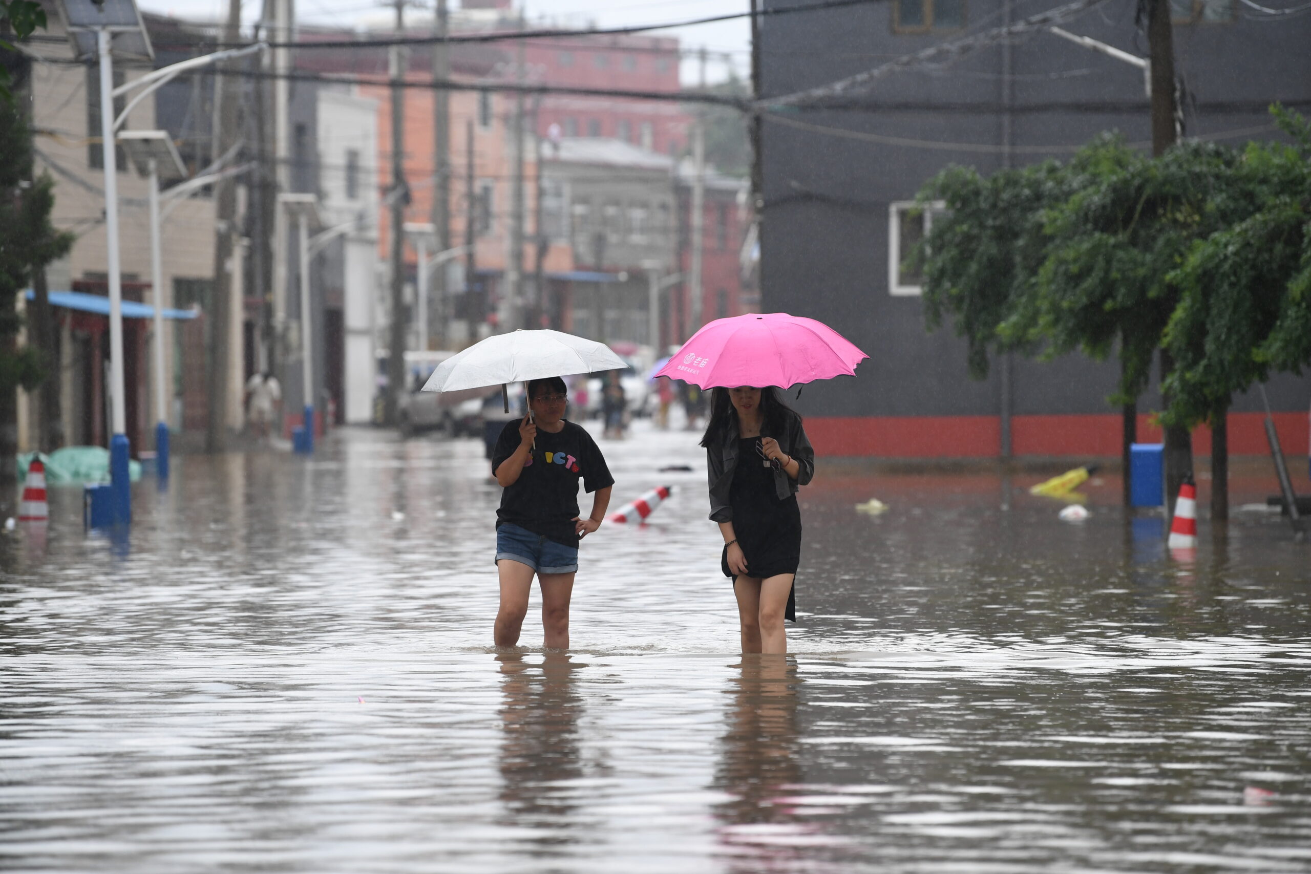 7月31日,市民行走在雨中的北京房山区瓦窑头村。北京市气象台当日10时发布分区域暴雨红色预警信号。北京市水文总站发布洪水红色预警,预计当日12时至14时,房山区大石河流域将出现红色预警标准洪水。