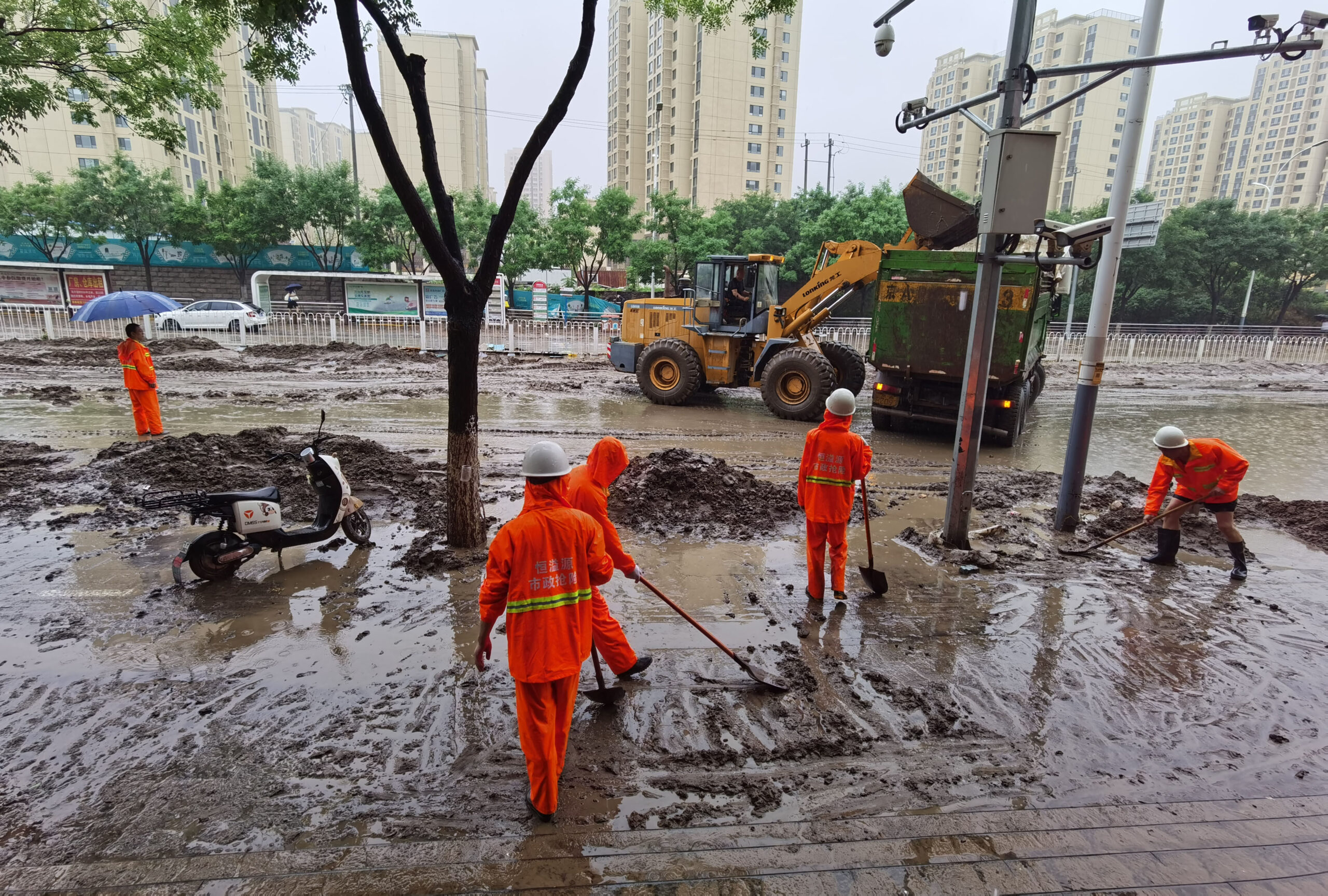 8月1日,北京市门头沟区,环卫工人和铲车清扫洪水退去后的淤泥以及杂物。