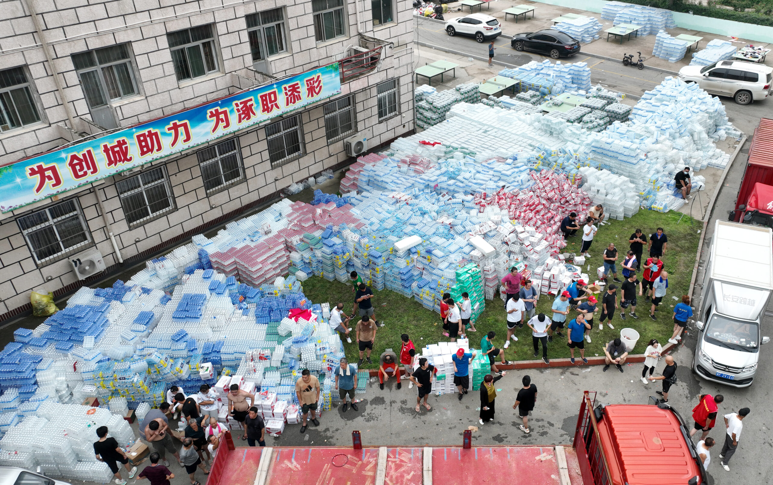 8月4日,航拍涿州市职业技术教育中心,这里是涿州一处接受救灾物资捐赠的地点。在防汛形势严峻的河北涿州,一车车来自中国各地的救灾物资,一个个互不相识的志愿者,都在为这座小城渡过难关注入力量。