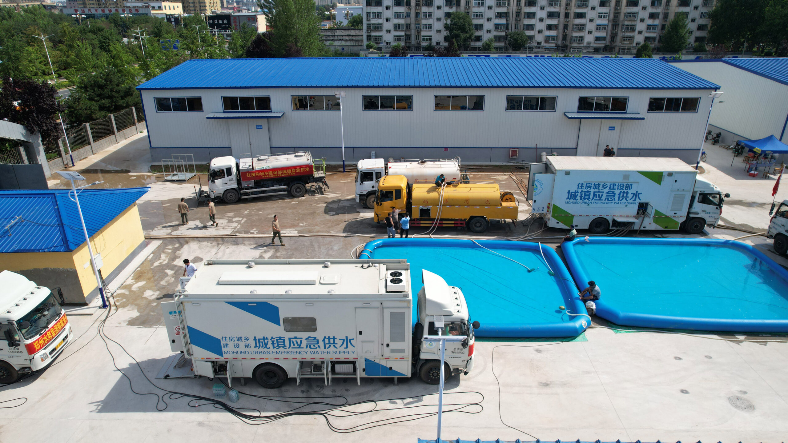 8月5日,中新社记者在河北涿州城区看到,积水逐渐退去,民众正常生活秩序逐步恢复。城区道路基本正常通行,供水、供电逐步恢复,商超货物供应充足。该市建起两座临时供水制水站,堪比“小型水厂”。图为当日,应急制水车在涿州市一个临时制水供水站点作业。