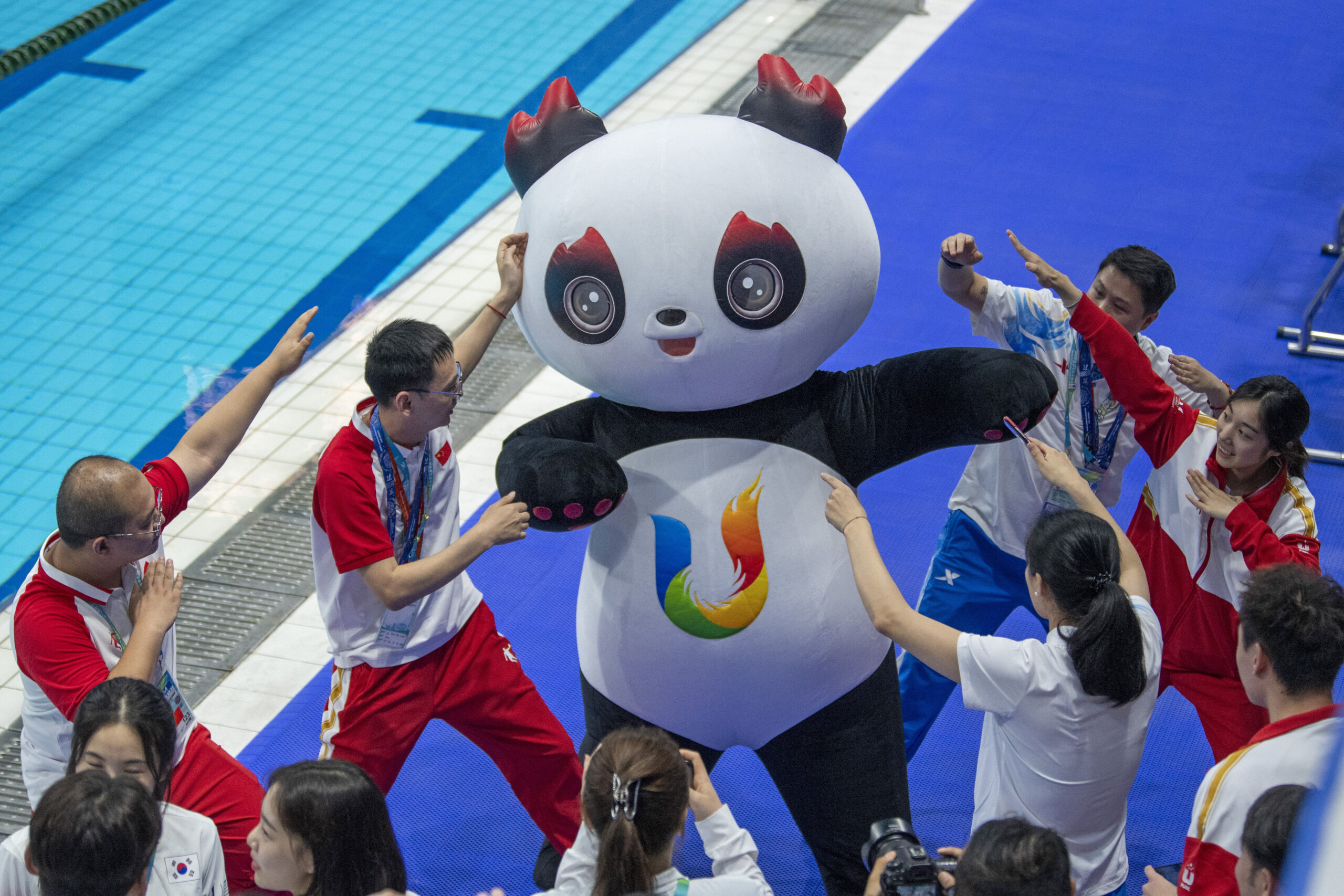 8月8日,第31届世界大学生夏季运动会竞赛日程正式迎来收官。成都大运会期间,憨态可掬的吉祥物“蓉宝”无疑是赛场内的“显眼包”,频频出现在各个比赛场馆与观众卖萌互动,成为除赛场上运动员外最受关注的“顶流”之一。图为8月7日,在成都大运会跳水比赛结束后,运动员、教练员等与“蓉宝”合影互动。