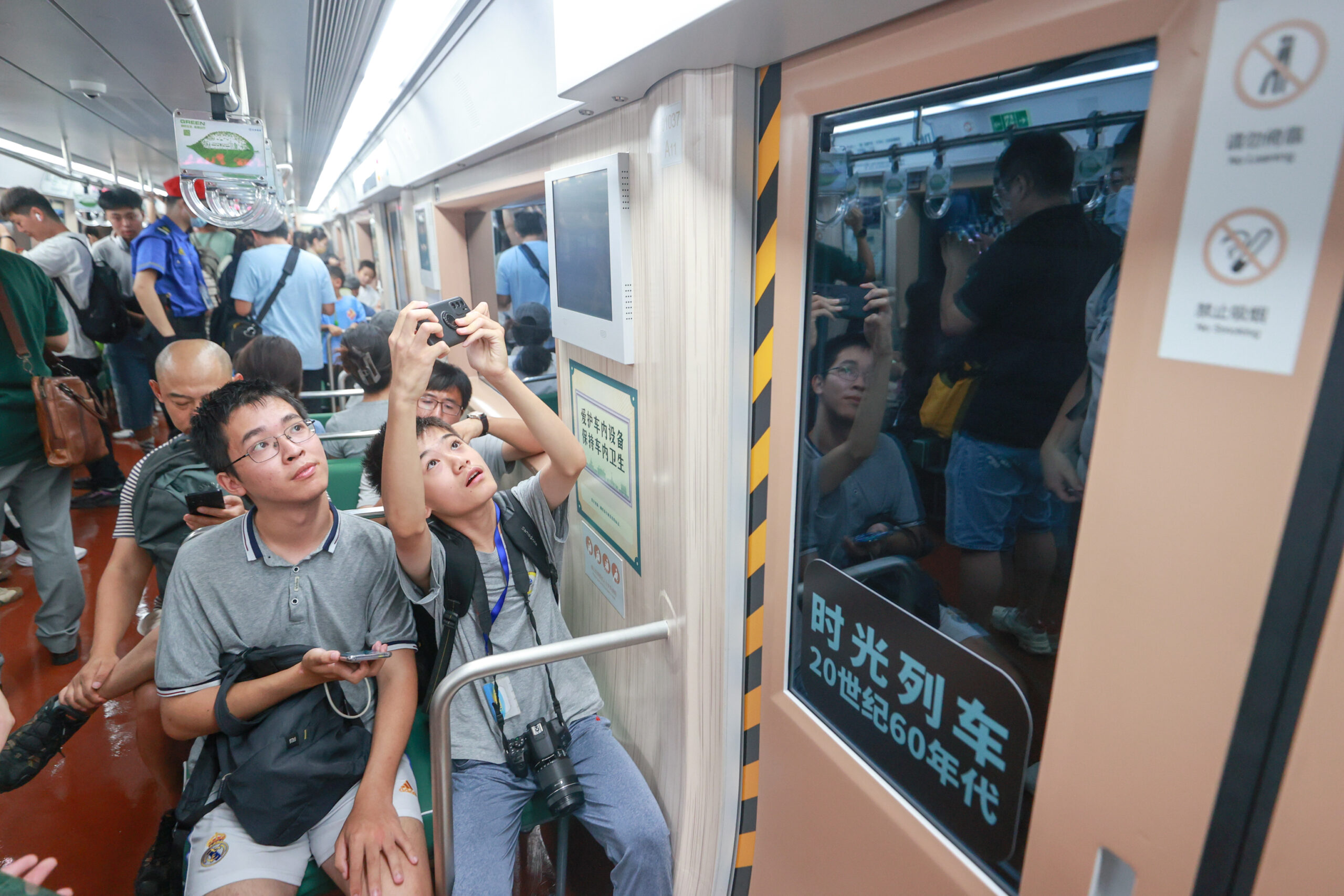 8月8日,乘客在车厢内打卡拍照。当日,北京地铁“时光列车”在1号线八通线上线试运营,运行区段为古城站——复兴门站区段。列车6节车厢打造的内容分别对应20世纪60年代到90年代,以及21世纪第一个十年和第二个十年至今,通过贴纸及部分设施还原,一定程度复刻每个时间段运营的典型车型外观外貌。这也是北京地铁首次尝试为乘客提供沉浸式“穿越时光”乘车体验。