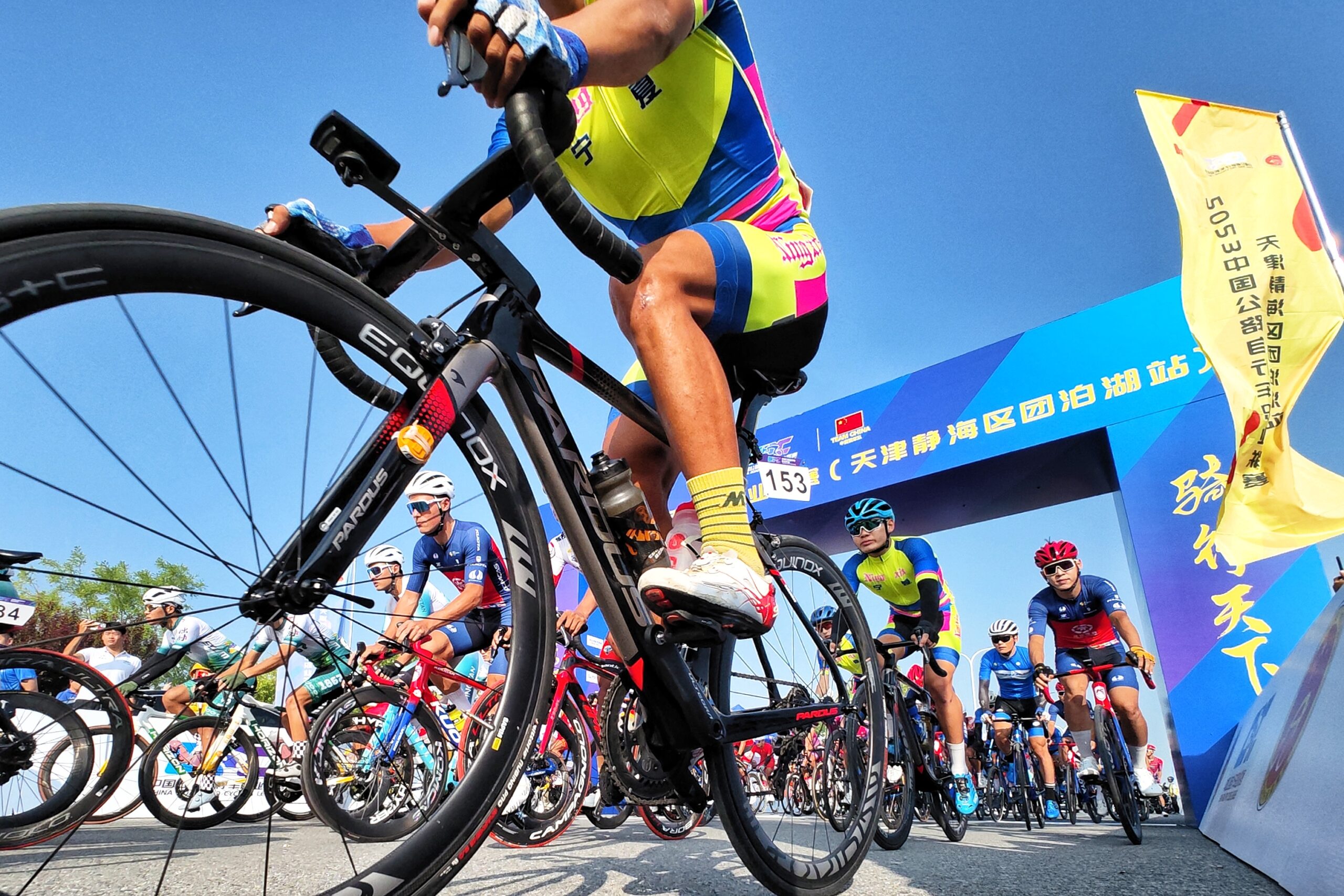 8月13日,2023首届中国公路自行车职业联赛(天津静海区团泊湖站)举行。图为参加职业赛的车手从起点出发。