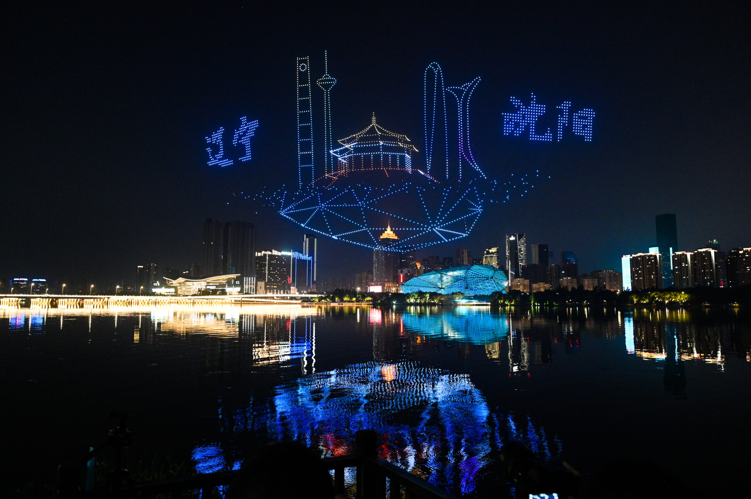 8月17日晚,辽宁沈阳,沈阳航空产业集团在浑河上空举办无人机矩阵表演。此次表演分为“辽宁发展”“沈阳风貌”“大国重器”和“飞行大会”四个篇章。图为无人机矩阵表演。 未经允许不得转载:城市新闻网icitynews » 沈阳:无人机表演亮相浑河上空