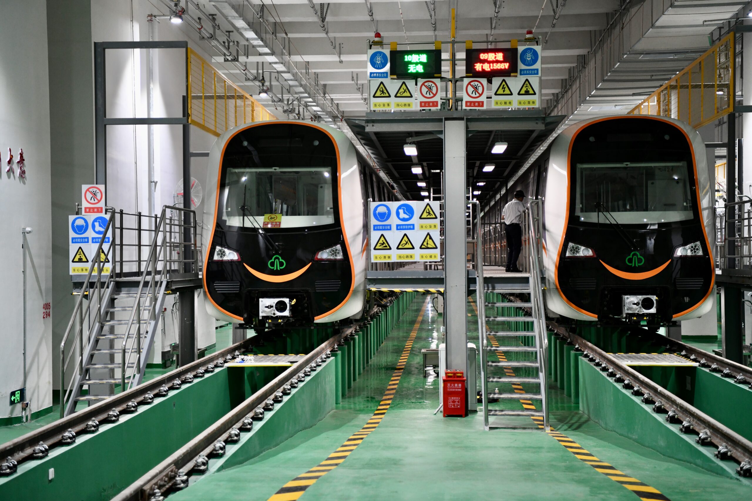 8月22日,福建福州,两列全自动驾驶的地铁4号线列车正在做通车前的最后准备。福州地铁4号线首通段将于8月23日至25日免费试乘,月底可载客运营,届时福州地铁将迈入“环线换乘”时代。