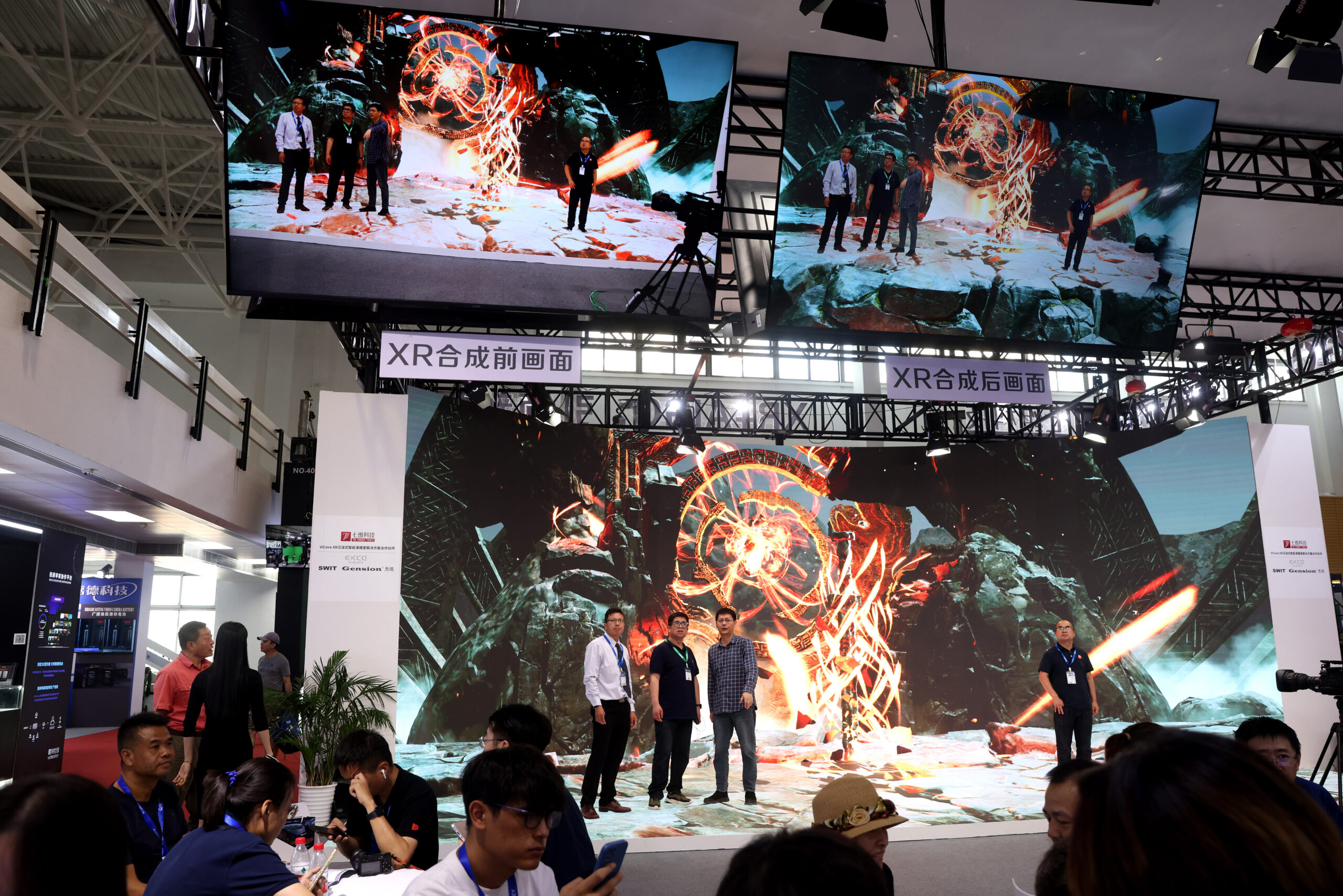 8月23日,第三十届北京国际广播电影电视展览会在北京举行,展览会展示内容覆盖广播电影电视和网络视听的采、编、播、存、管等全产业链。图为观众参观XR沉浸式演播室系统。