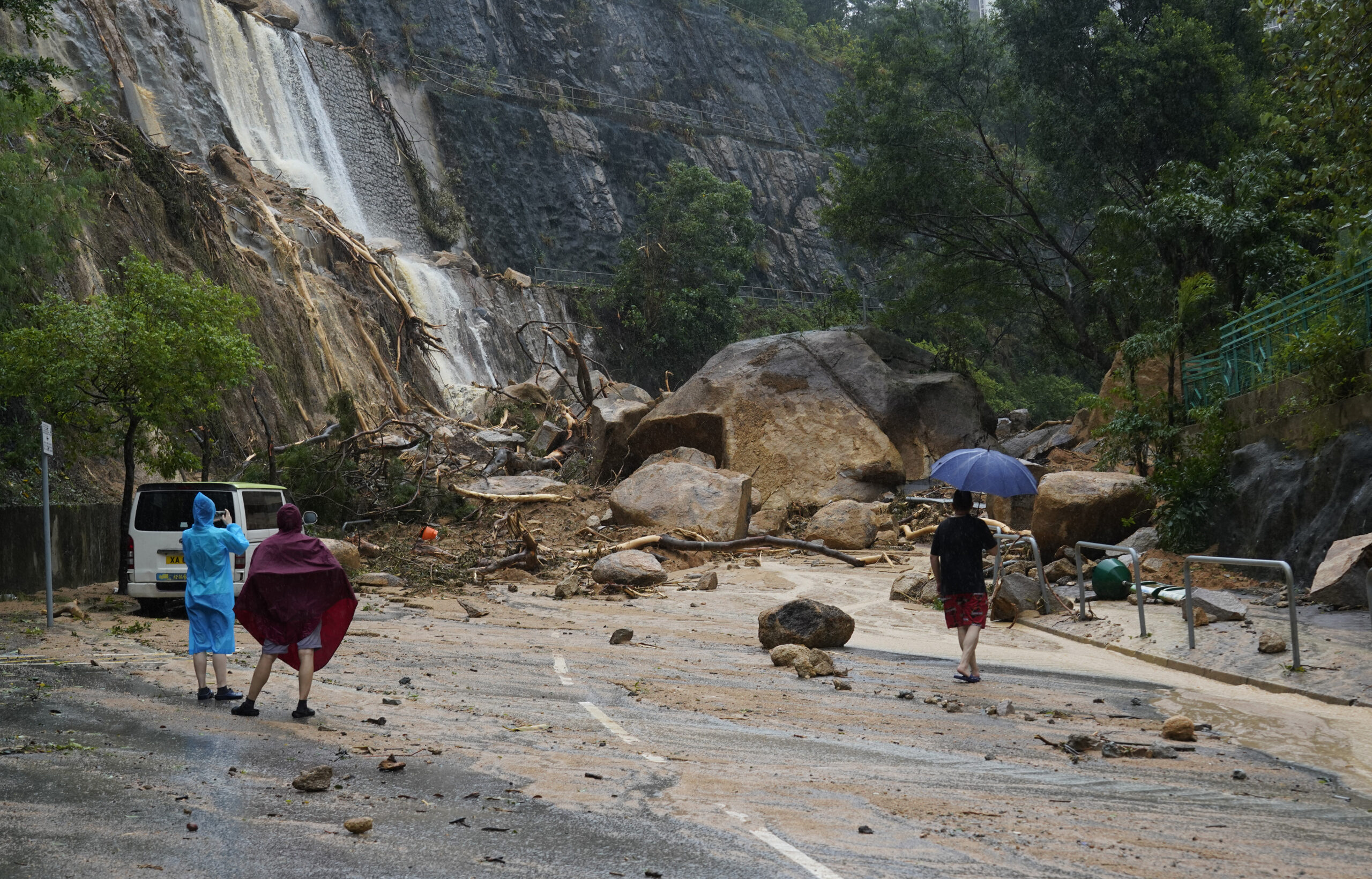 9月8日,持续强降雨造成香港特别行政区港岛东区筲箕湾耀兴道一个地段发生滑坡泥石流,滑落的巨石阻断道路。图为市民观看山体滑坡的状况。 未经允许不得转载:城市新闻网icitynews » 香港强降雨造成东区一处发生滑坡泥石流