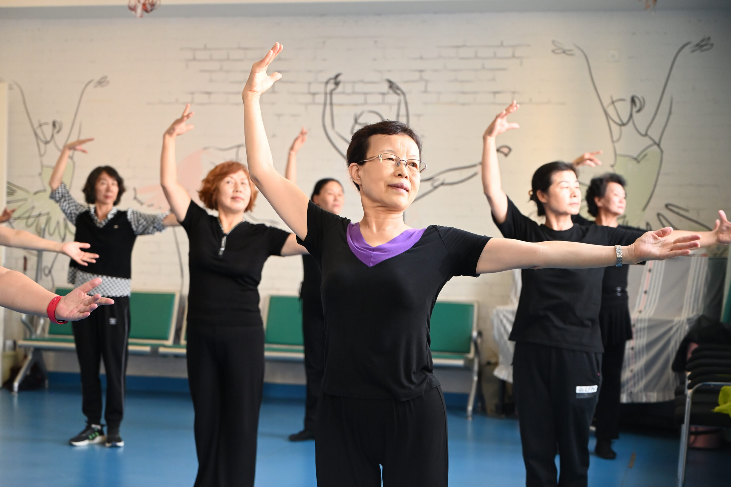 9月14日,内蒙古呼和浩特市,老年大学学生学习舞蹈。当日,内蒙古开放大学城乡社区学院公主府社区老年大学开学,学校迎来首届60余名新生。该大学设有书法、剪纸、瑜伽、舞蹈、化妆、服装搭配共6个专业,面向中老年,许多学生为附近居民。