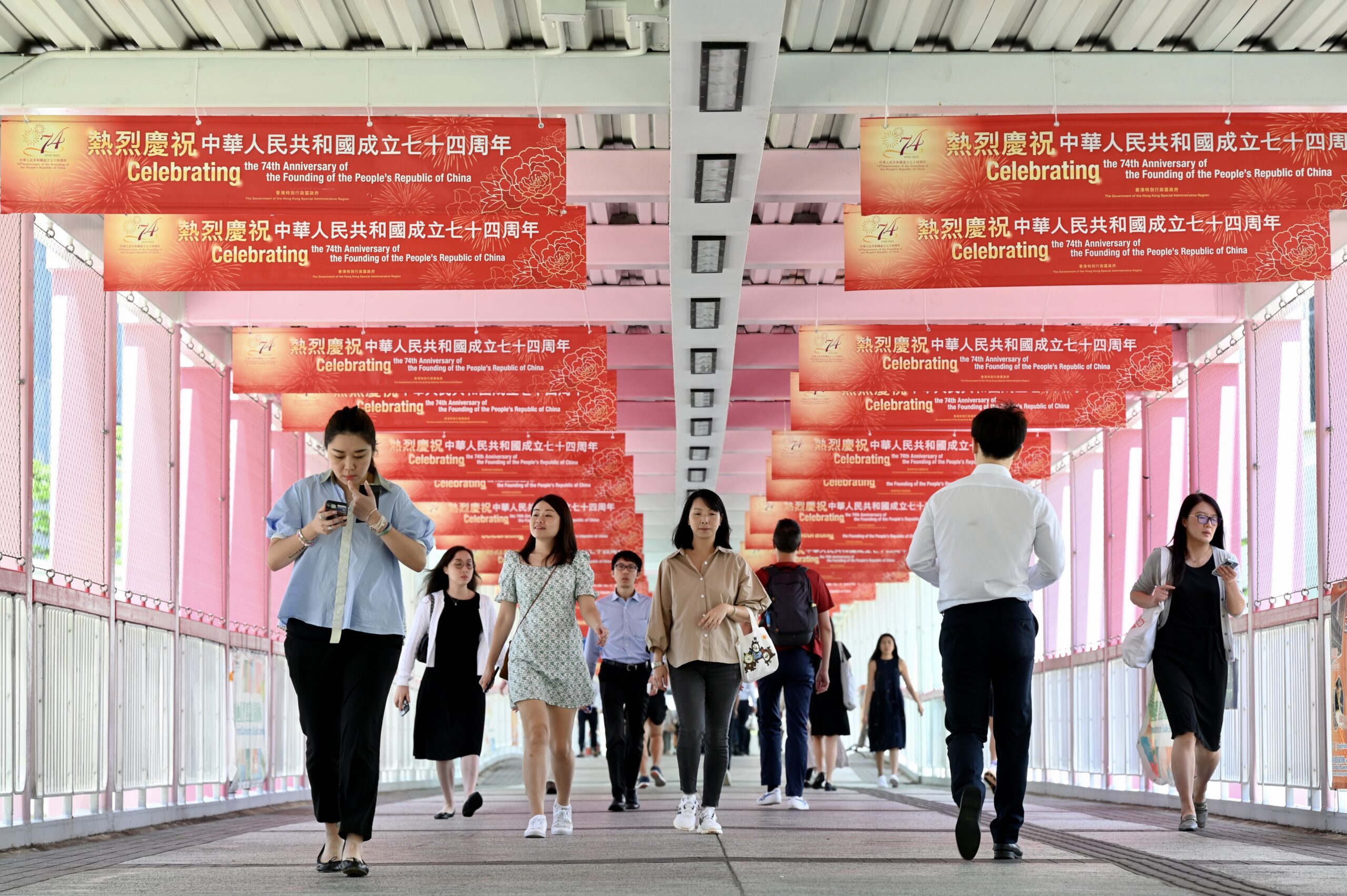 国庆将至,9月20日香港金钟一带的灯柱、围栏及天桥等处,纷纷装饰上写有庆祝国庆的横幅及彩旗,为庆祝中华人民共和国成立七十四周年营造气氛。图为香港金钟一连接特区政府总部的天桥上挂满庆国庆横幅。
