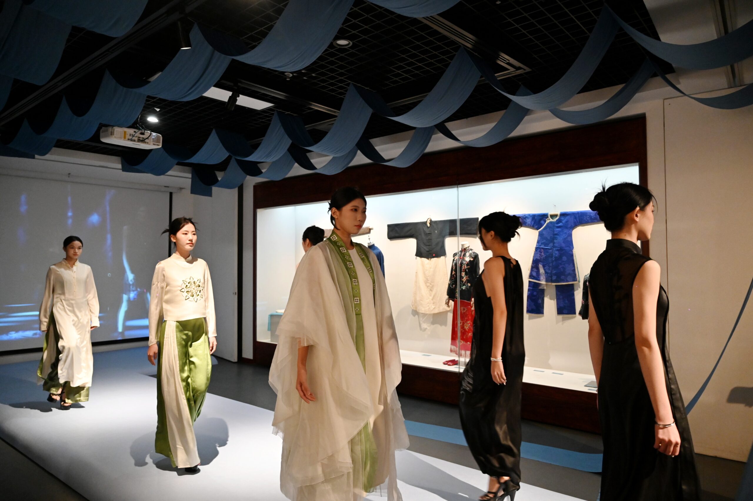 9月25日,广东广州,“穿粤岭南时尚 共赏美好生活”——广东服饰文化展在广东省方志馆开展,展览包括“岭南服饰变迁史”“传统服饰风格”“岭南特色风采”等部分。图为模特展示服饰