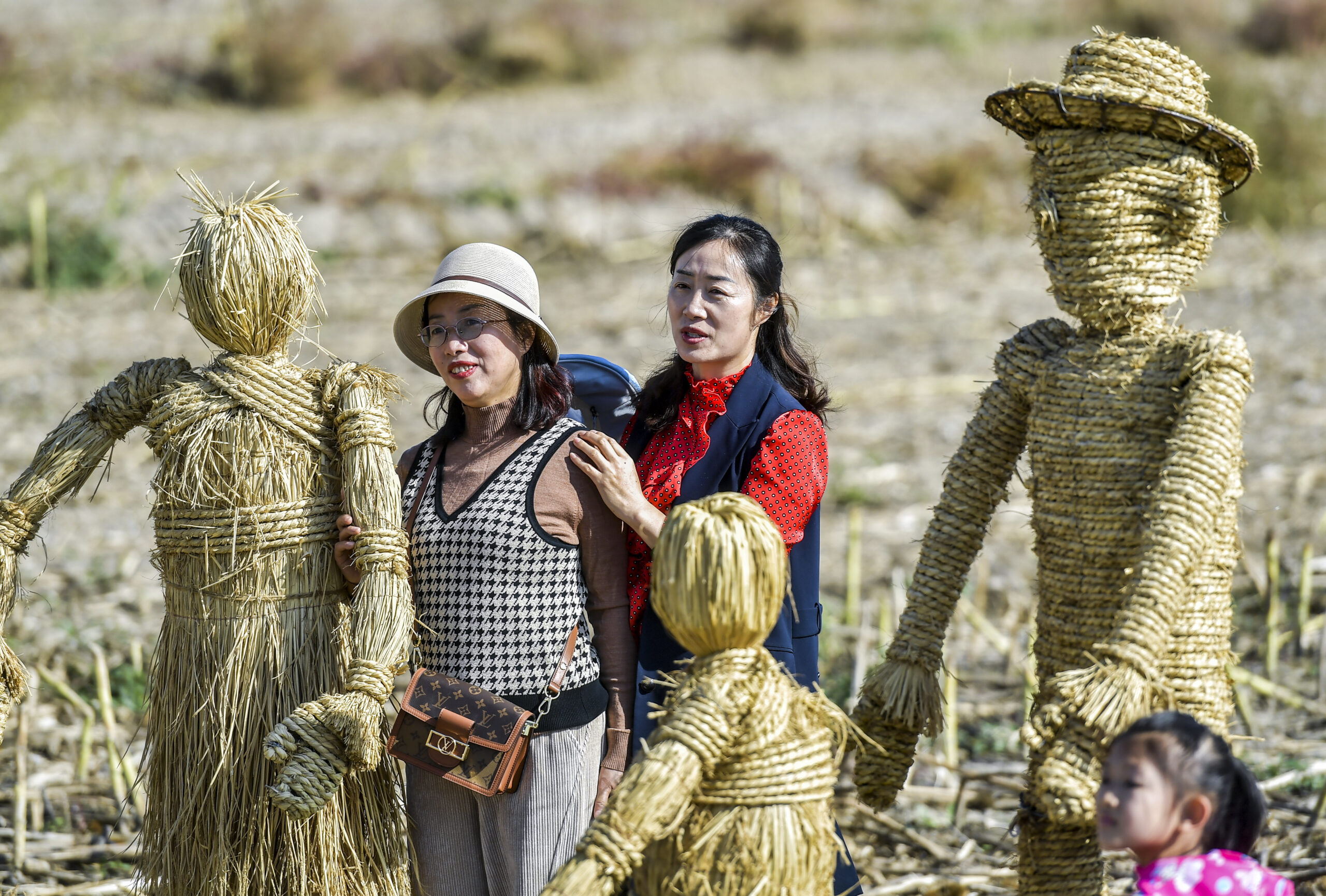 10月2日,新疆乌鲁木齐市米东区,在农田旁打造的稻草人景观道吸引游客前来打卡。“稻梦田园”稻草人景观道,由20组以丰收为主题的稻草人组成,造型各异,惟妙惟肖。