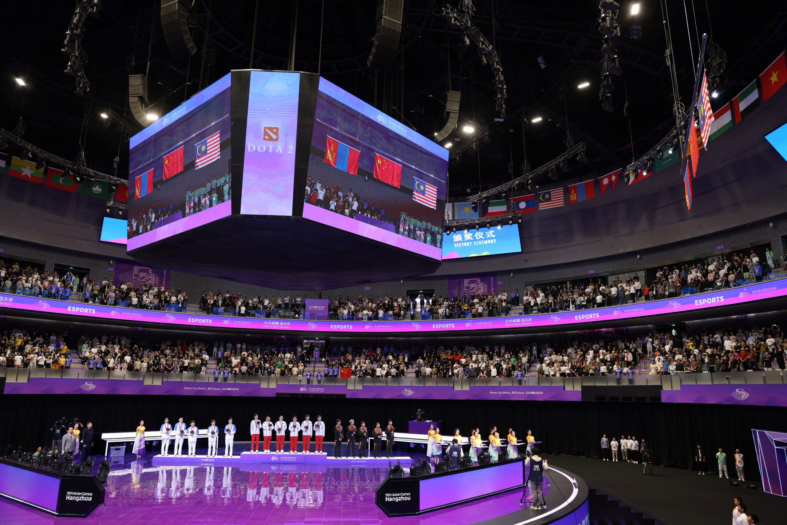 10月2日,杭州第19届亚运会电子竞技项目刀塔决赛在杭州电竞中心举行。中国队夺得金牌。图为颁奖仪式。