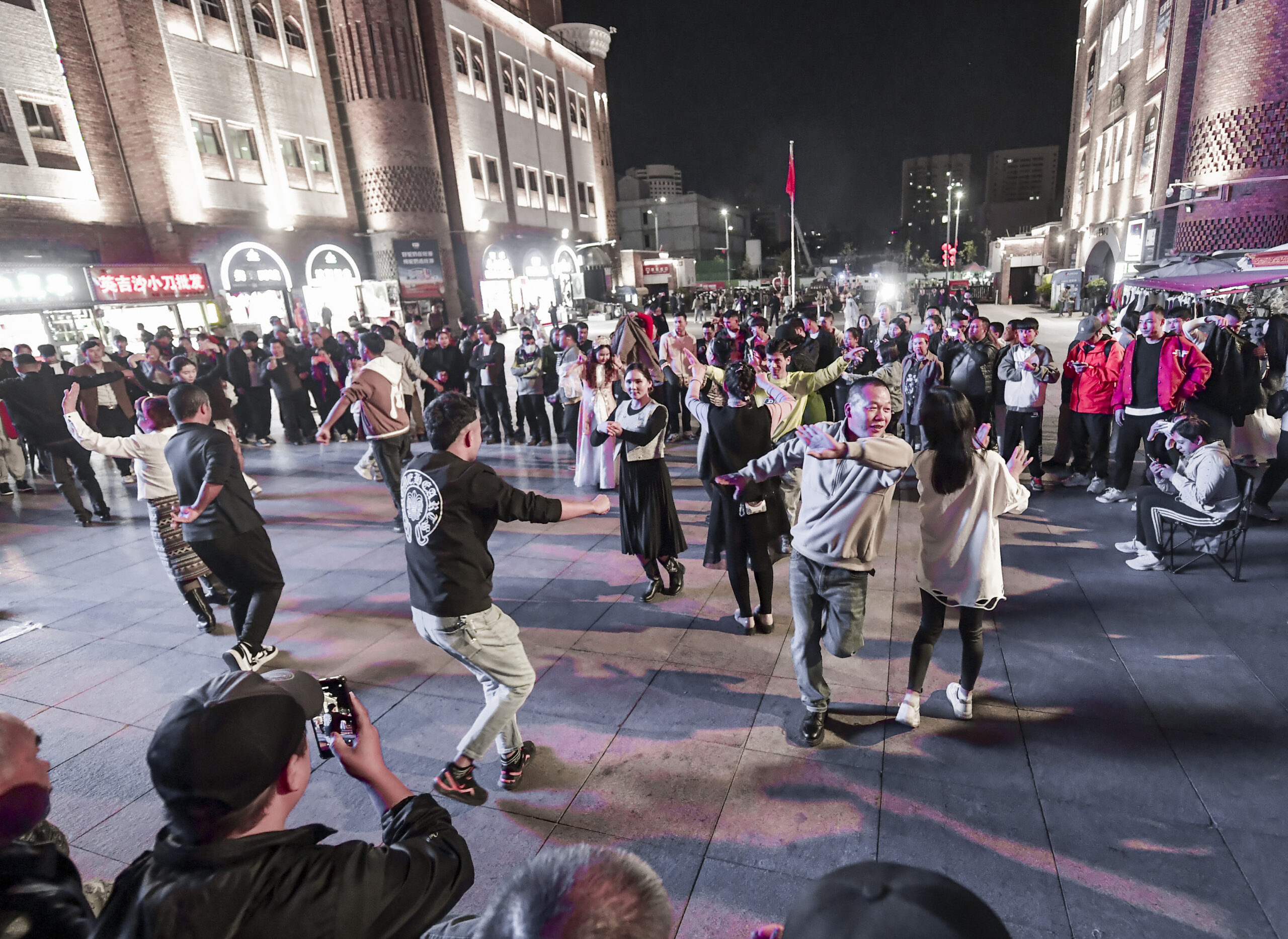 10月5日晚,新疆乌鲁木齐大巴扎景区,游客与当地民众一起跳舞。夜晚的大巴扎景区灯光璀璨,人潮如涌。游客们跟着欢快的音乐跳起舞蹈、体验旅拍、品尝特色美食等。中秋国庆“双节”假期,该景区迎来客流高峰,单日客流最高峰达到近20万人次。