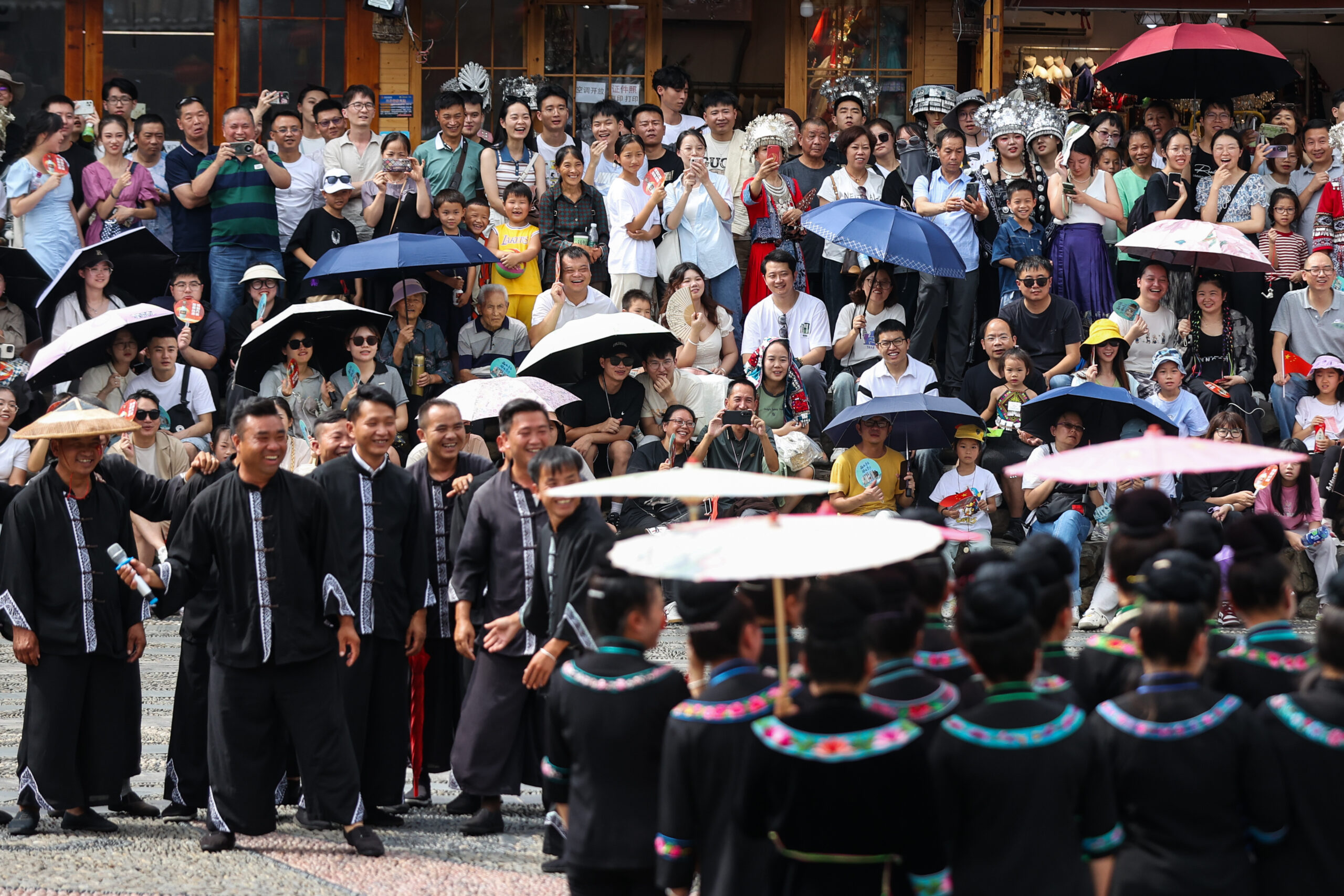 10月6日,中国文化和旅游部发布的消息显示,2023年中秋节、国庆节假期,文化和旅游行业恢复势头强劲,全国假日市场平稳有序。经文化和旅游部数据中心测算,中秋节、国庆节假期8天,国内旅游出游人数8.26亿人次,按可比口径同比增长71.3%,按可比口径较2019年增长4.1%;实现国内旅游收入7534.3亿元人民币,按可比口径同比增长129.5%,按可比口径较2019年增长1.5%。图为10月1日,贵州省黔东南州雷山县西江千户苗寨景区民俗表演吸引游客观看。