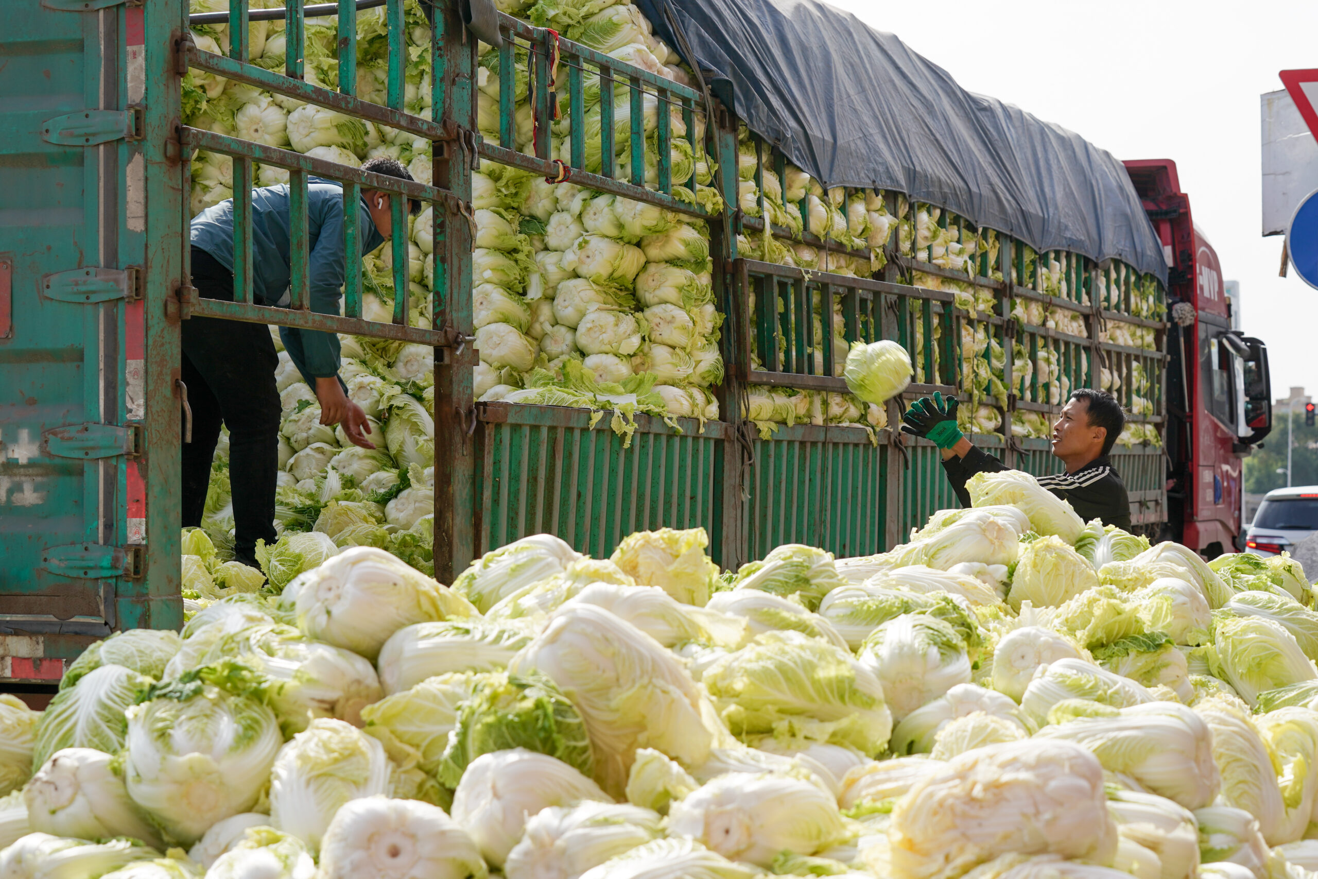 10月8日正值寒露节气,黑龙江哈尔滨,市民开启“囤秋菜”模式,为即将到来的冬天做准备。满载大葱、白菜、土豆等秋菜的货车停靠在指定销售区域,市民们穿梭其中挑选秋菜。储存秋菜过冬已成为东北人独特的“过冬仪式”。图为商贩正从车上卸白菜。
