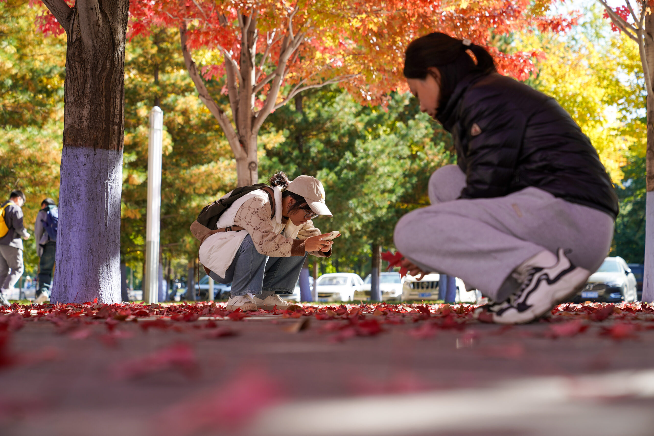10月10日,黑龙江省哈尔滨市,两名学生在拍摄、捡拾枫叶。近日,哈尔滨工程大学图书馆前的40余棵枫树逐渐变红,吸引不少观赏者前来拍照打卡。 未经允许不得转载:城市新闻网icitynews » 黑龙江哈尔滨:民众大学校园内赏“枫”景
