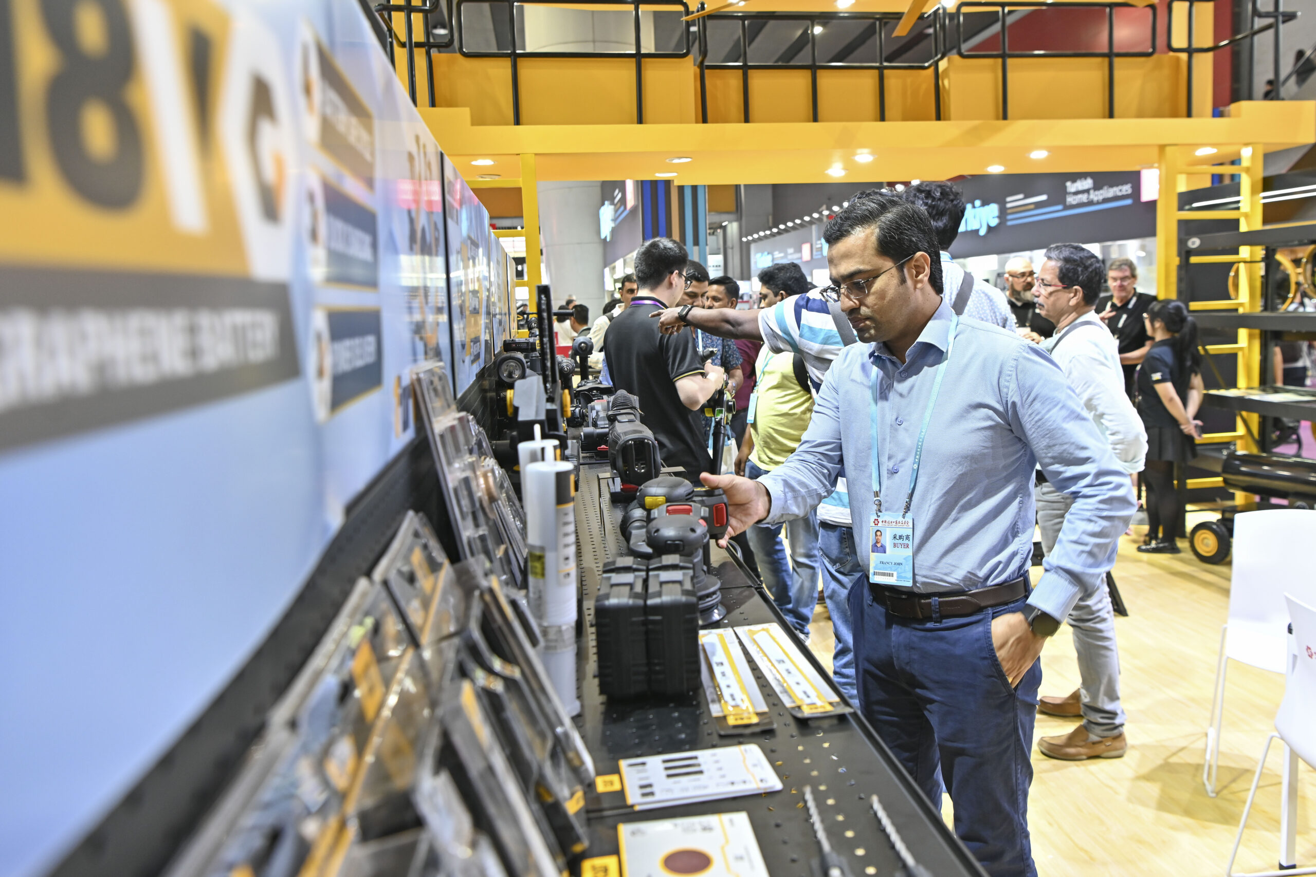 10月16日,广东省广州市,采购商在进口展上挑选产品。第134届广交会进一步扩大进口展规模,来自43个国家和地区的650家企业参展,其中“一带一路”共建国家参展企业占比60%。
