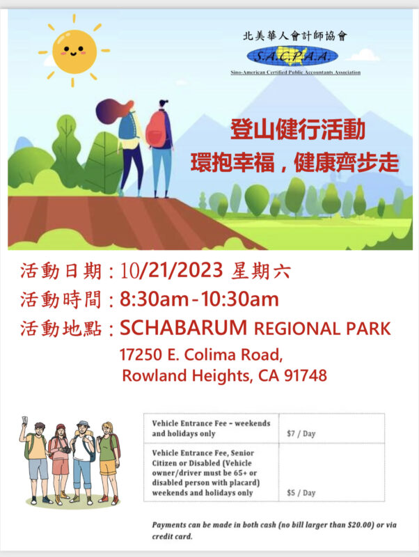 会长张青会计师溫馨提醒:氣溫:65F – 75F;注意保暖防曬,10:00am完成爬山活動。建議帶好防曬液,帽子,登山杖,適合走路的運動鞋,外套一件。停車費:$7/$5(Senior)(停車7美金,65歲以上5美金)