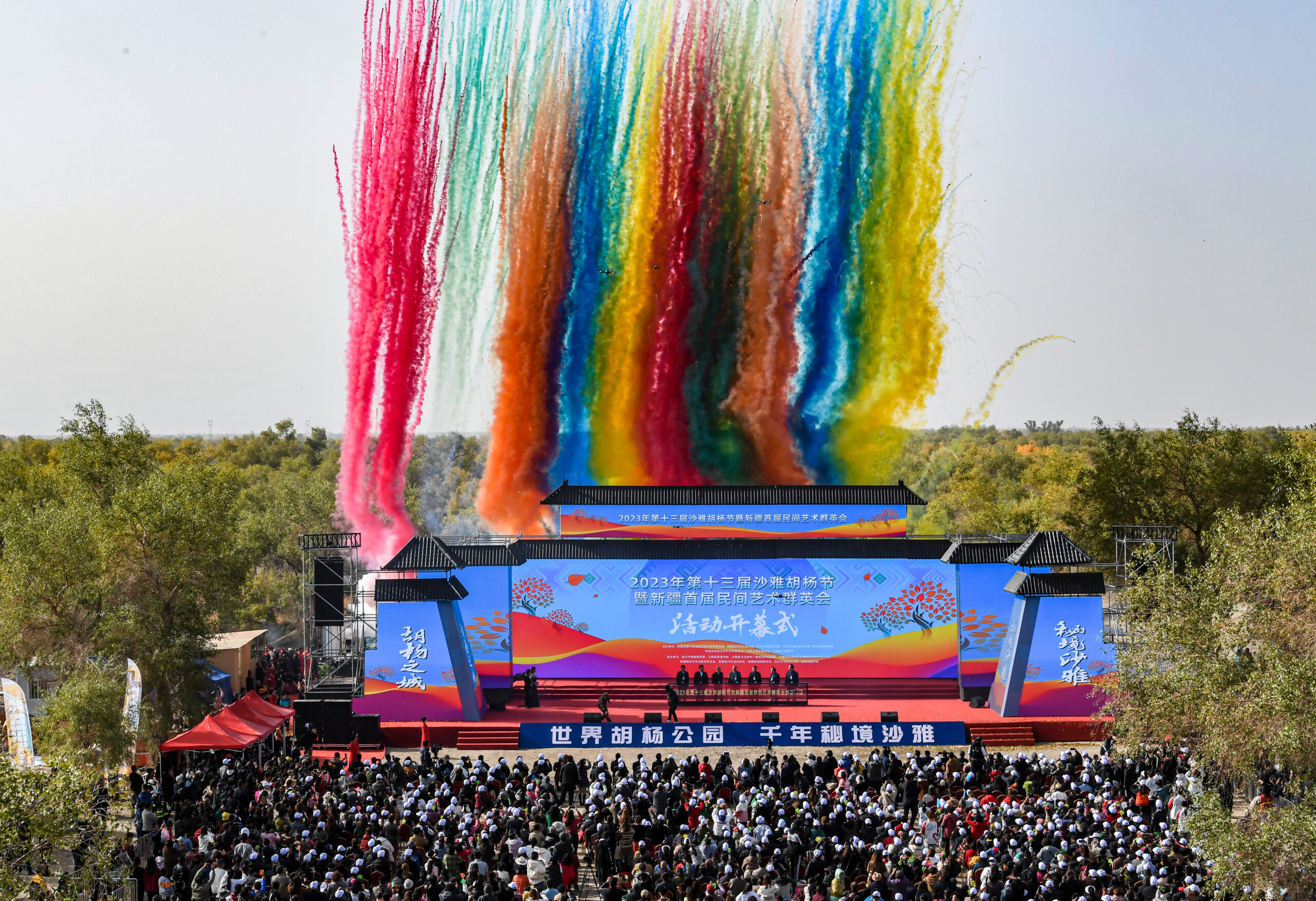 10月21日,2023年第十三届沙雅胡杨节暨新疆首届民间艺术群英会在阿克苏地区沙雅县塔里木河湿地旅游景区开幕。