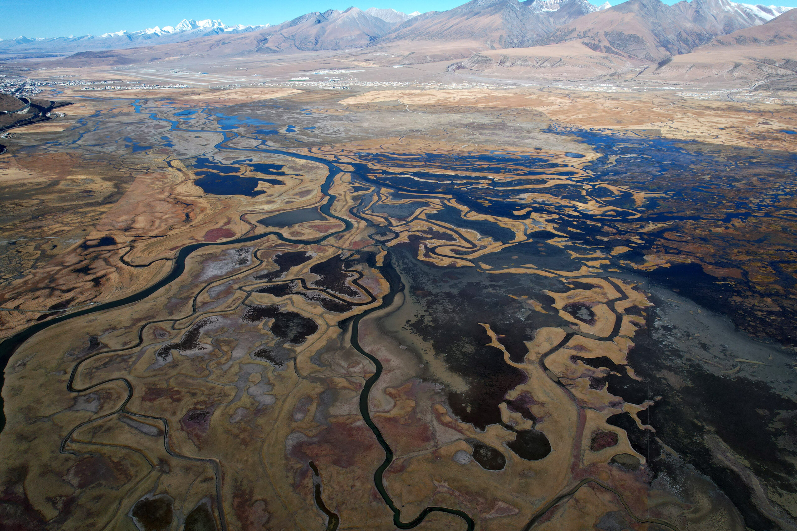 10月24日,深秋的阿热湿地,阡陌纵横的水系与牧草形成了一幅色彩斑斓的画卷。阿热湿地位于西藏拉萨市当雄县城东北侧,属于典型的高原草甸湿地类型,在涵养水源、调节气候、维持生态系统平衡等方面发挥重要作用。