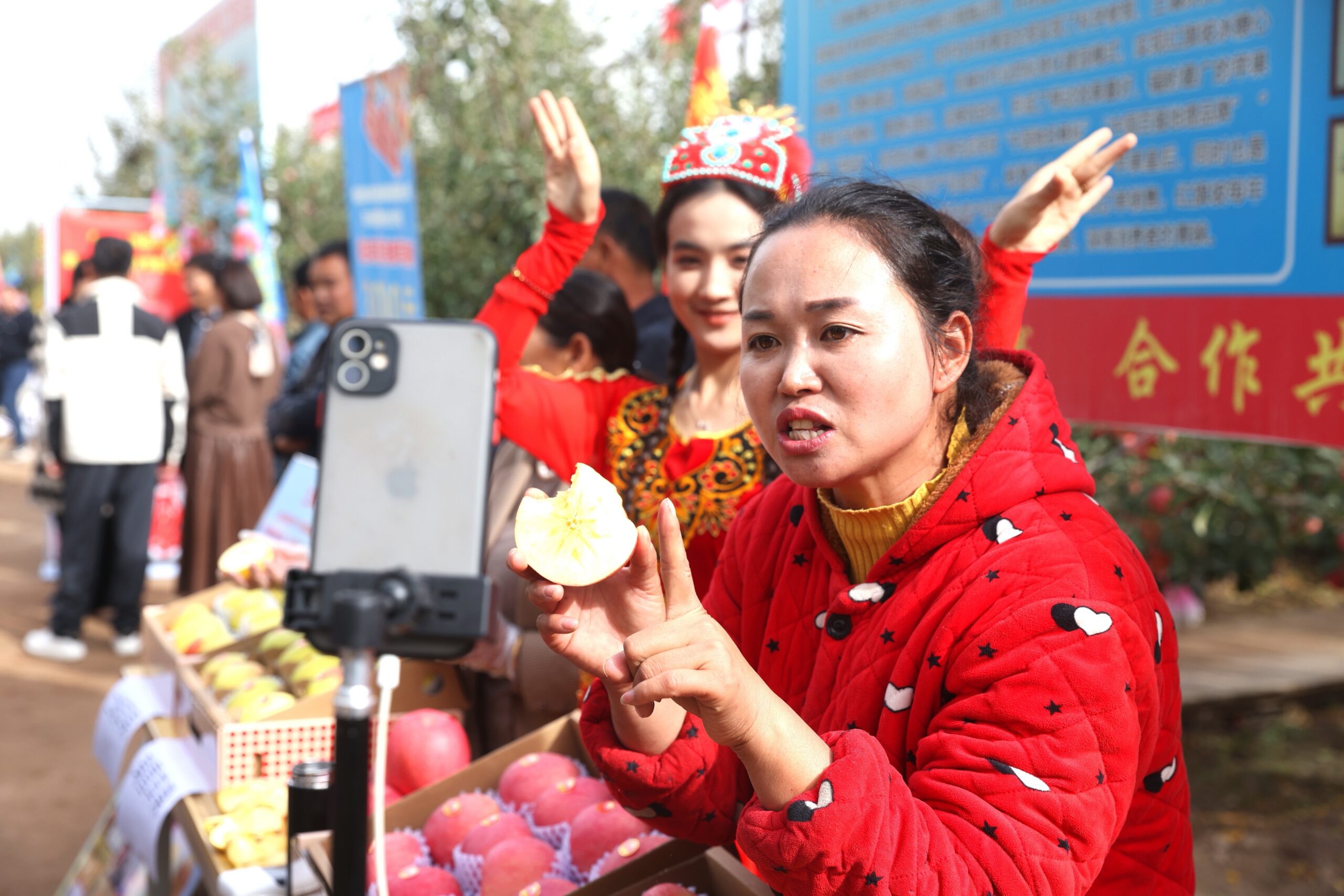 10月23日,新疆阿克苏地区首届苹果文化旅游节暨采摘季活动在阿克苏温宿县开幕。阿克苏是新疆的优质特色果品主产区,拥有14个地理标志证明商标。目前,全地区苹果种植总面积50.48万亩,总产量81.72万吨,已形成苹果种植、生产、加工、销售、观光旅游等为一体的“三产”融合发展新模式。图为电商在阿克苏红旗坡果园内直播销售。
