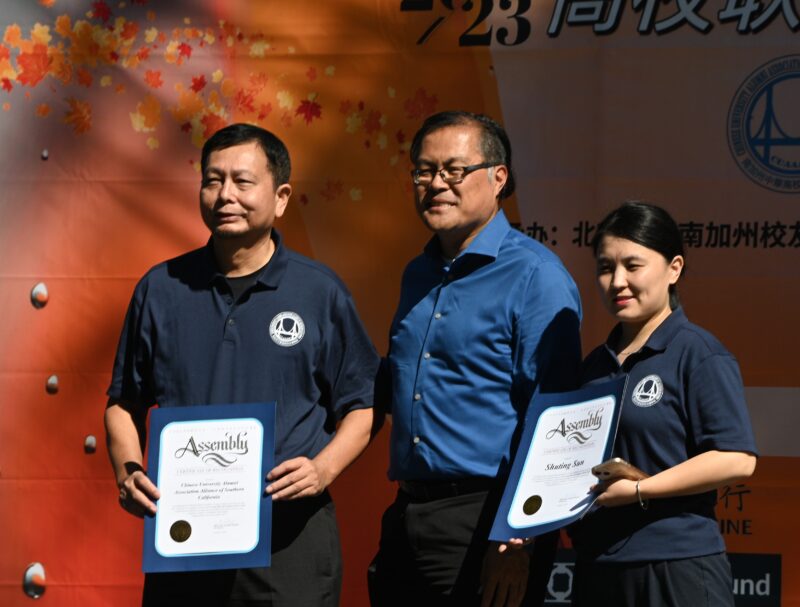 加州众议员方树强向高校联盟会长孙淑婷、理事长伦炳强颁发贺状