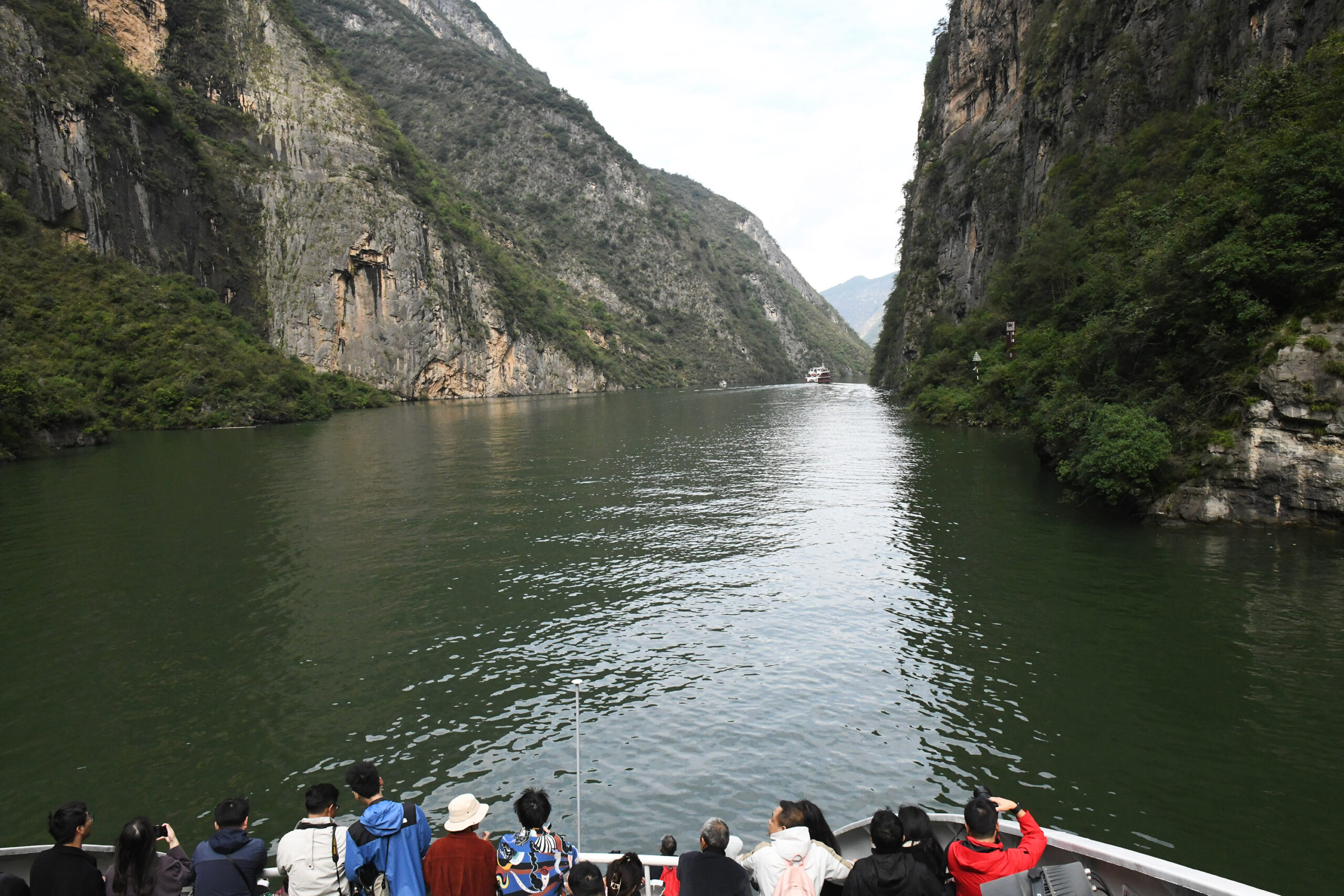 10月28日,民众在重庆市巫山县乘船欣赏小小三峡风景。近日,三峡水库水位蓄至正常蓄水位175米,这是三峡水库自2010年以来第13年完成175米蓄水目标。