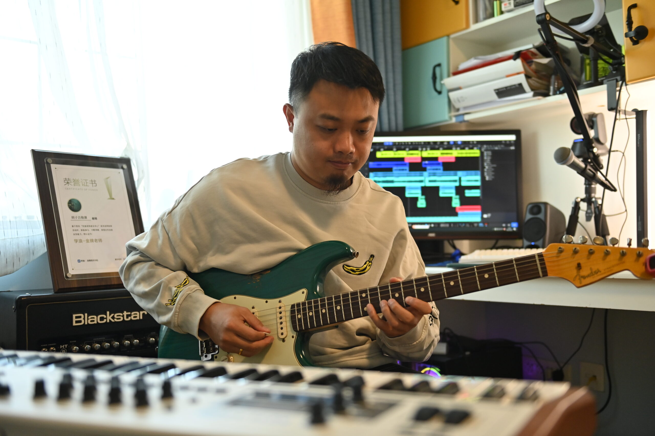 当悠扬婉转的马头琴声响起,低沉深邃的蒙古族“呼麦”随之振荡开来,紧接着是小提琴余音袅袅……这是甘肃“85后”蒙古族音乐人巴依勒格的又一次探索。十余年来,他和乐队成员不断探索更符合年轻人音乐审美的“时尚狂欢”。这种中国民乐与西洋乐碰撞融合的灵感,缘于巴依勒格在西北民族大学读大学时的音乐氛围——各类民族音乐互动“百花齐放”,中西方乐器同台演绎“百家争鸣”。2010年,他名为“朝格组合”的乐队由此诞生。图为10月23日,甘肃省兰州市,“朝格组合”成员姜巍在其工作室进行音乐创作。