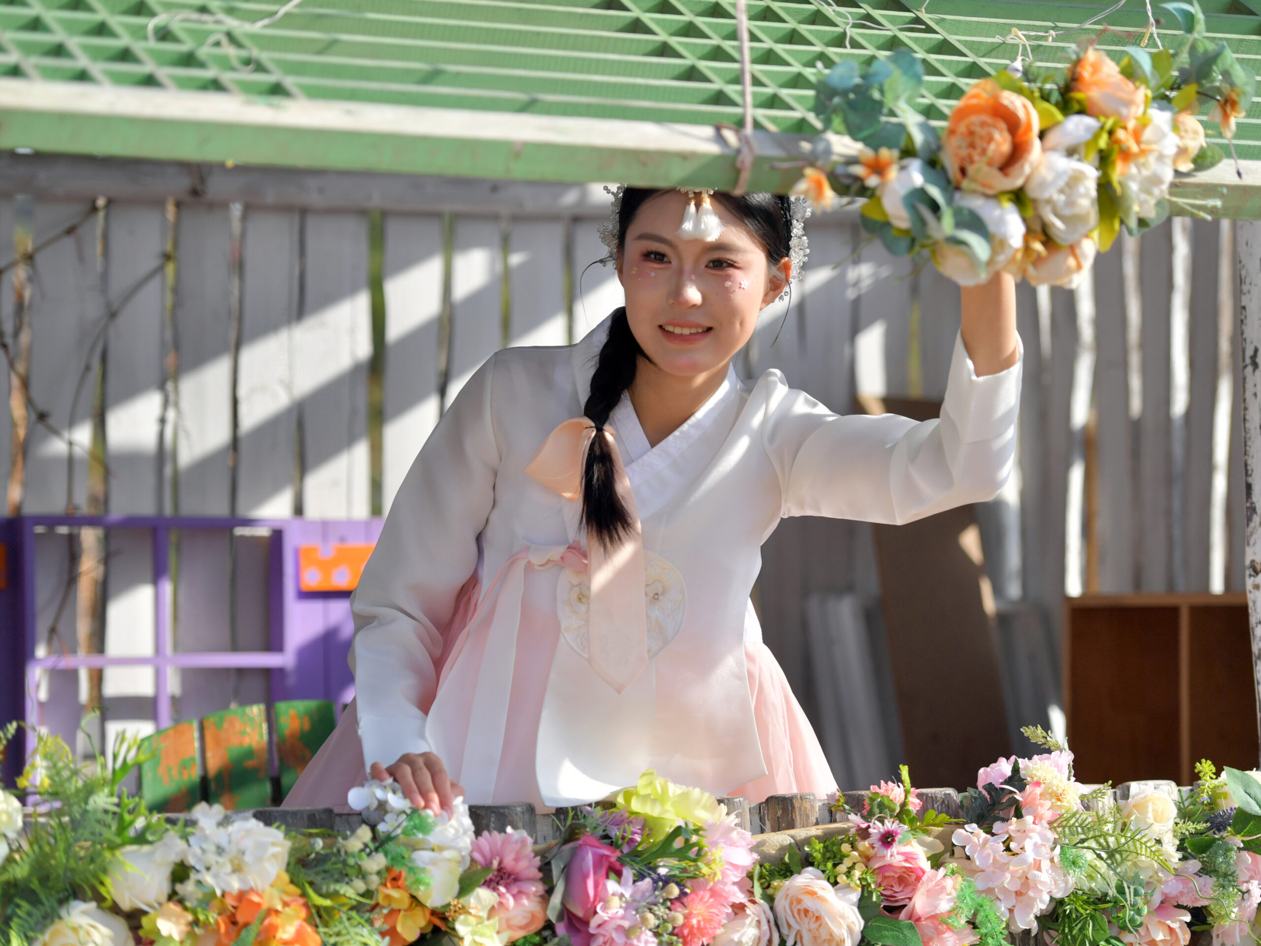 11月4日,在吉林省延边朝鲜族自治州延吉市的中国朝鲜族民俗园内,游客身着朝鲜族服饰拍照留念。延边是中国最大的朝鲜族聚居区,浓郁的民族风情吸引大量游客前来观光体验。