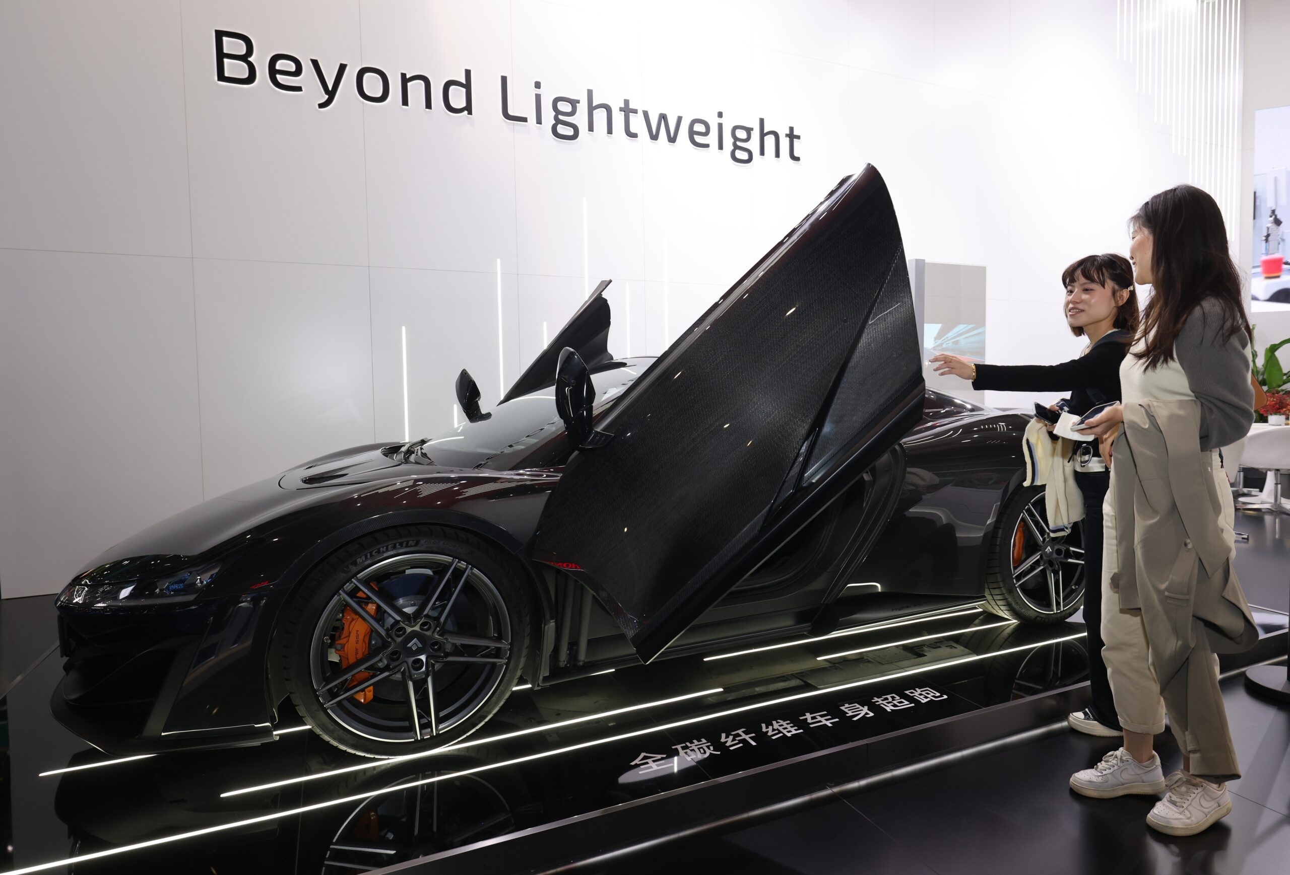 11月7日,第六届中国国际进口博览会在国家会展中心(上海)举行,汽车展区HRC展台展出零百加速仅为1.9秒的昊铂SSR全碳纤维车身量产跑车,车身较传统材料减重超过25%,整车强度提升超2.5倍。