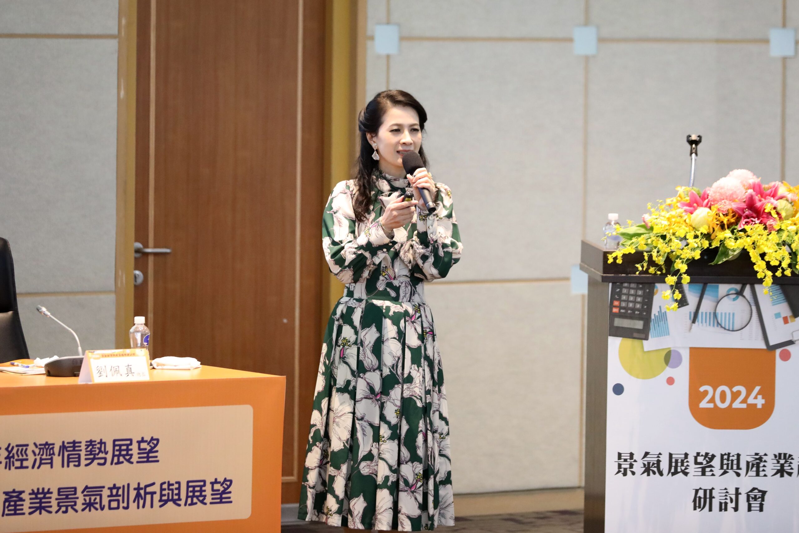 11月8日,台湾经济研究院在台北举办2024年景气展望与产业趋势研讨会,预估2024年台湾经济增长率为3.15%。图为台经院产经资料库总监刘佩真发言。