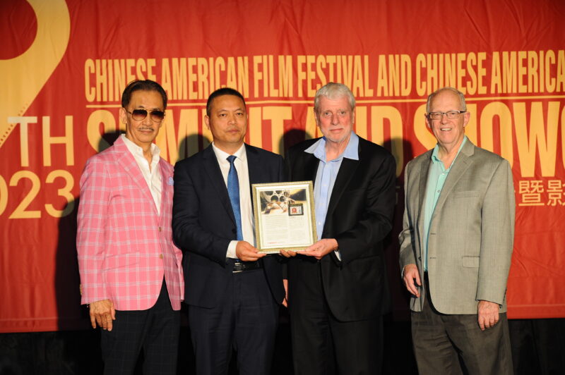 中美电影节共同主席、奥斯卡得主Andre Morgan(右二)、中美电影节委员、奥斯卡奖得主和艾美奖得主Richard Anderson(右一)和中美电影节委员、好莱坞演员张宇基(左一)在发布会上,代表中美电影节组委会送上代表友谊长存的“中美电影节纪念邮票”,表示希望未来能够有机会去贵州走一走看一看,无论是旅游还是拍摄影视作品,都将是一次难忘的奇妙之旅。