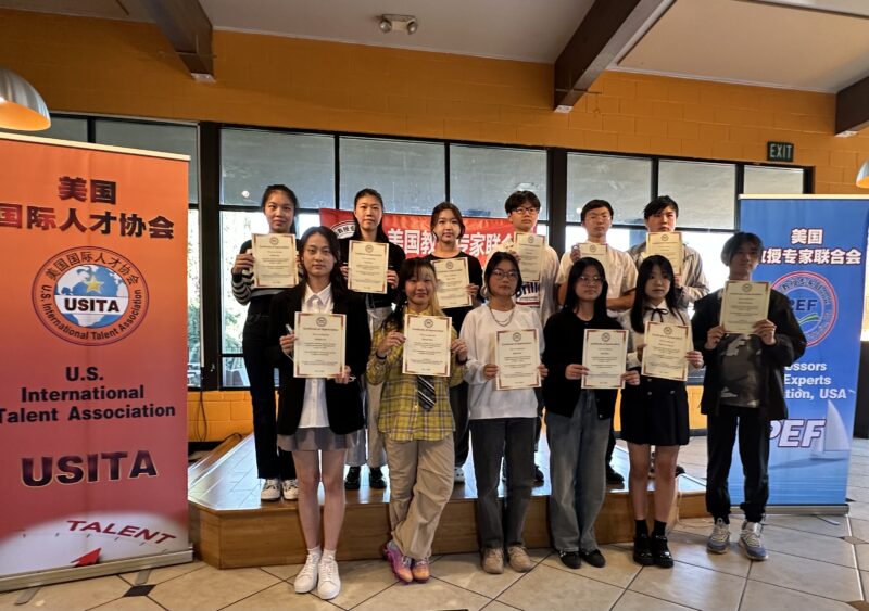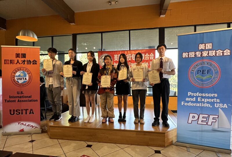 学生演讲者获颁证书,左起:孙泰然,Yuqi Feng,刘玲炜,任姿璇,刘御琪,郭旗,Tony Yao