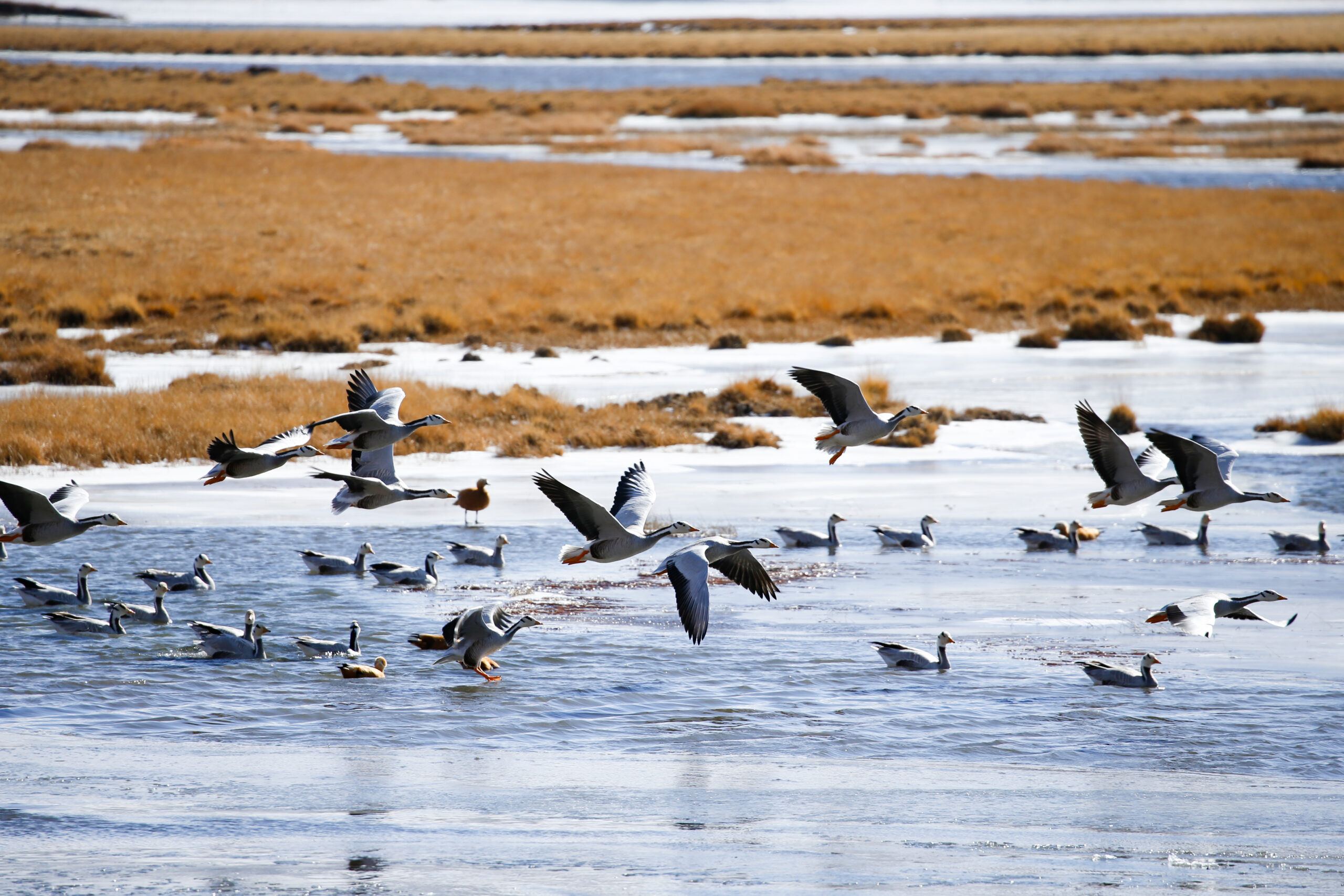 11月15日,成群斑头雁在隆宝滩国际重要湿地内展翅飞翔。近日,成群候鸟来到隆宝滩国际重要湿地栖息、觅食,为越冬进行“能量补给”。该湿地位于青海省玉树藏族自治州玉树市境内,拥有典型的内陆湿地和水域生态系统,生物多样性丰富。
