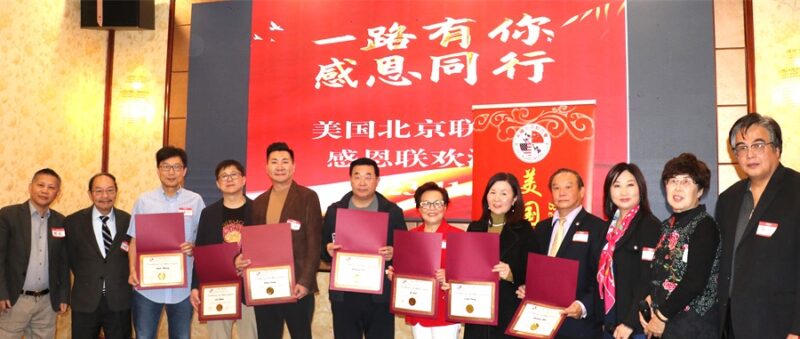美国北京联合会为参与今年8月份给北京特大洪水赈灾重建家园乐捐的社团代表和个人颁发感谢状,同时还为所有参与旧金山迎送习近平主席出席APEC会议的会员代表们颁发奖状并庆功。