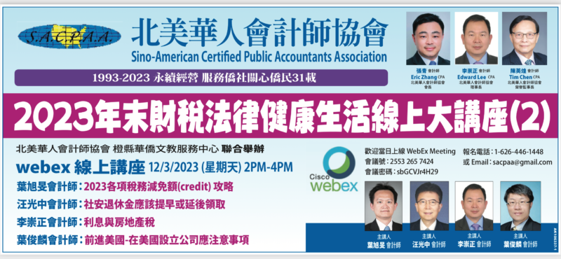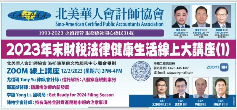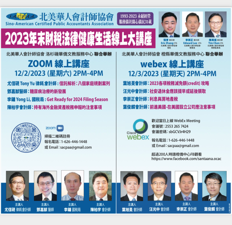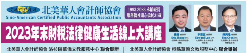 城市新闻11月29日洛杉矶报导,北美华人会计师协会将于 12/2/2023 – 12/3/2023下午2:00 – 4:00举办在线专业讲座,讲座分别由北美华人会计师协会于洛杉矶华侨文教服务中心和橙县华侨文教服务中心联合举办。两场讲座涵盖话题广泛,与大家的生活以及财税规划息息相关,内容精彩。北美华人会计师协会会长张青会计师吁请大家踊跃参加,不容错过。
