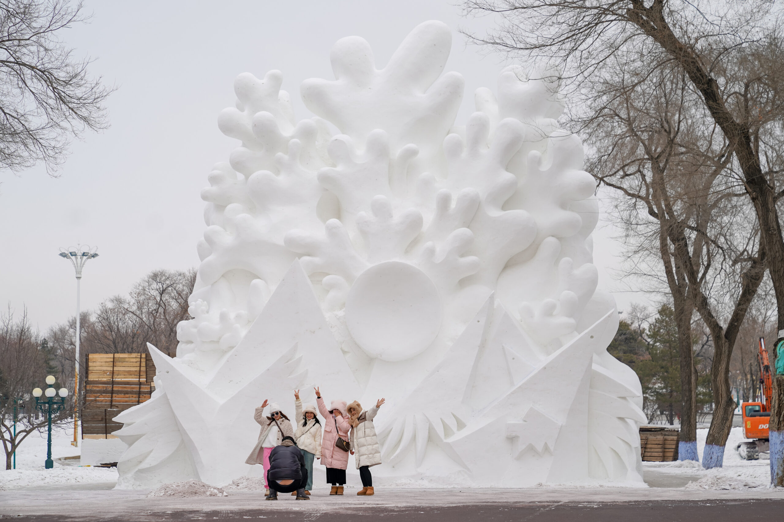 12月4日,黑龙江哈尔滨,来自湖北的游客一行五人在雕刻成型的雪雕前拍照打卡。据悉,哈尔滨第36届太阳岛雪博会已进入全面建设期,园区所有建设工作正紧张有序地推进。今冬,太阳岛雪博会将在100万平方米的规划面积内,建设赛事及艺术雪雕约232处,总用雪量15万立方米。