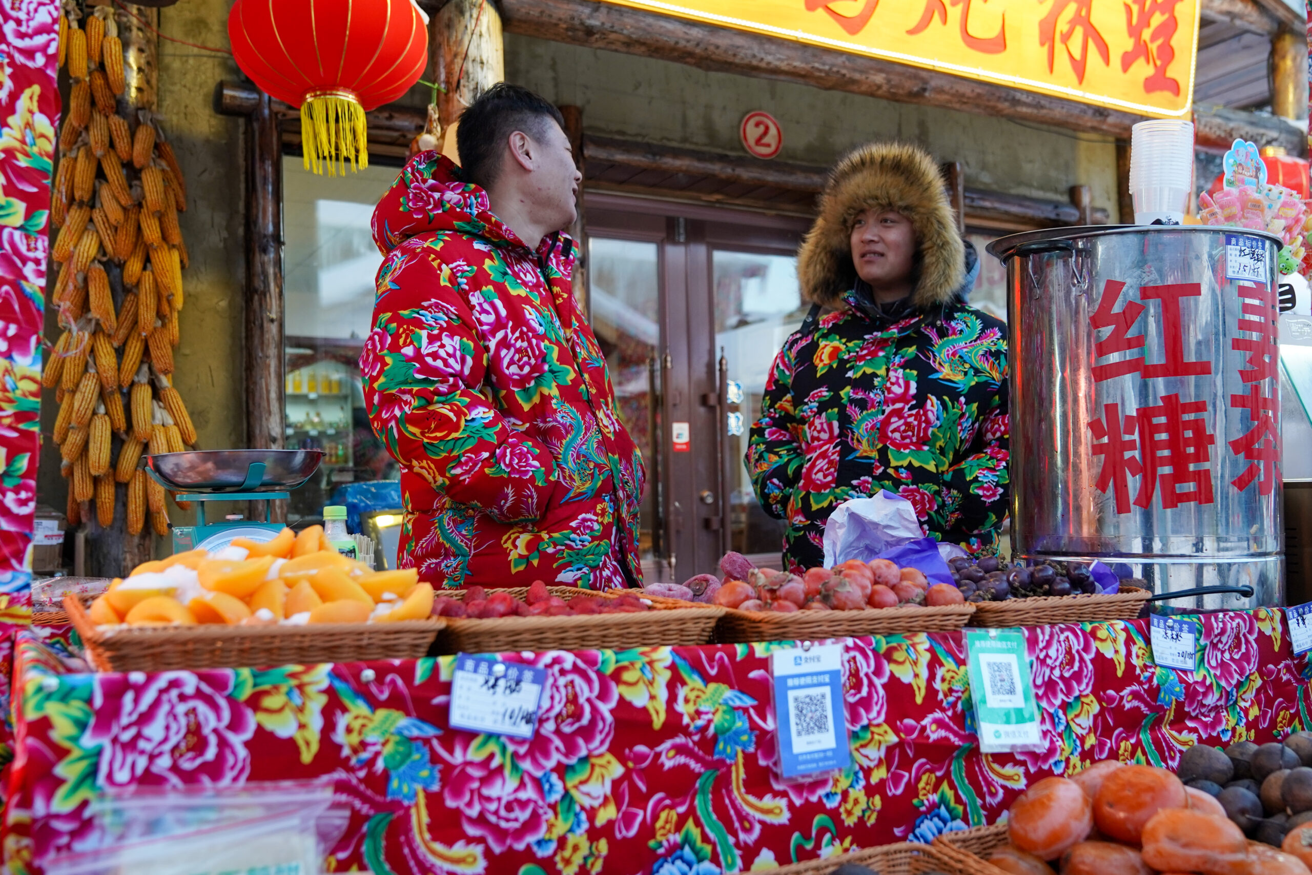 12月6日,黑龙江中国雪乡风景区内的商家用由大花桌布包裹摊位。近日,大花棉袄、大花桌布等纷纷亮相在雪乡的街道上,“花红柳绿”的东北大花成为流行元素。 未经允许不得转载:城市新闻网icitynews » 黑龙江海林:“东北大花”成雪乡流行元素