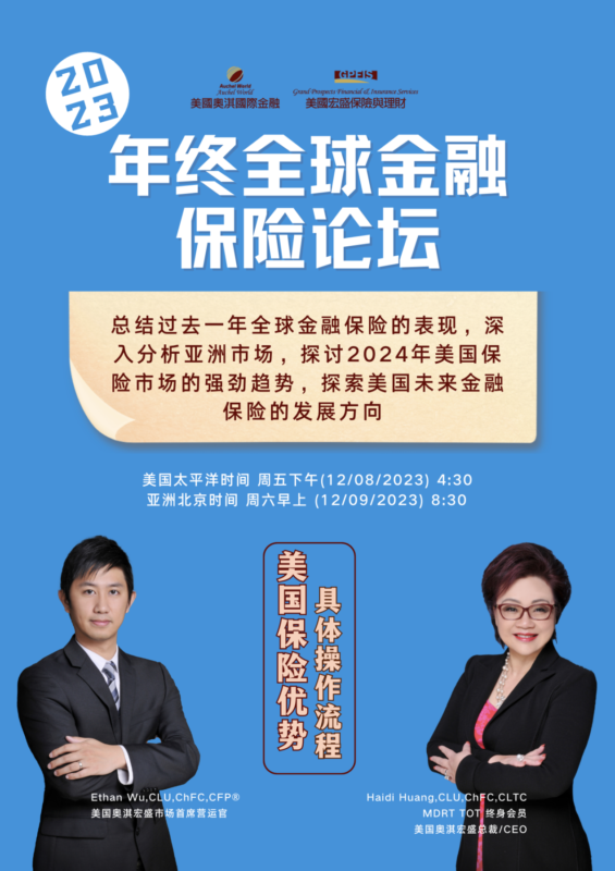 美国奥淇宏盛在2023年12月8日美国太平洋时间4:30pm(北京时间12月9日早8:30) 在工业市总部成功举办了一场盛大论坛,主题为年终全球金融保险发展趋势。我们特邀美国奥淇宏盛总裁及CEO Haidi Huang黄海蒂女士与美国奥淇宏盛市场部首席营运官Ethan Wu先生为大家深入解析全球包括亚洲和美国金融保险行业发展现状及趋势,以及美国人寿保险行业的热门产品、销售流程、适合人群等行业热点洞察分析,并探索美国未来金融保险行业的发展方向。
