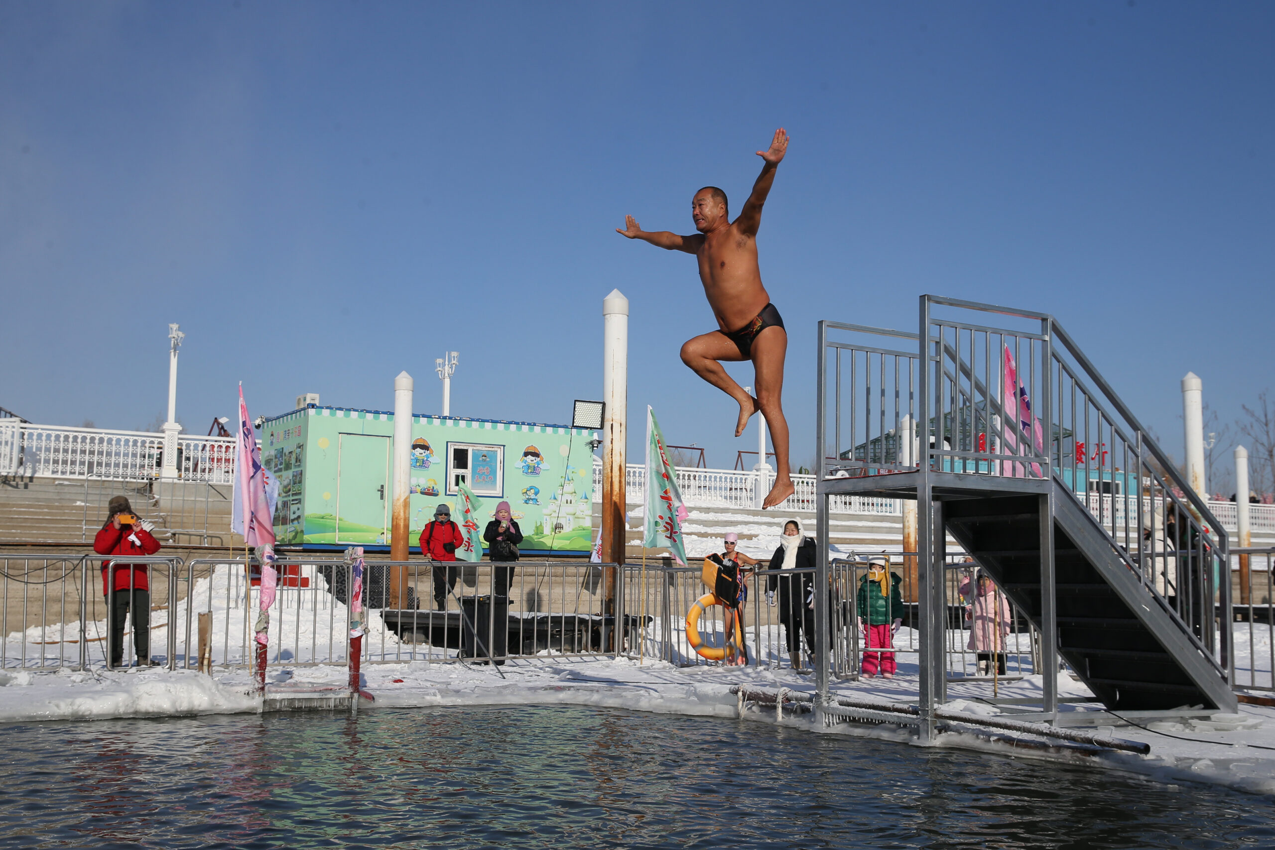 12月12日,冬泳爱好者在黑龙江省哈尔滨市外滩雪人码头冬泳区域,进行冬泳健身活动,吸引游客驻足拍照。当日,哈尔滨最高气温零下17摄氏度。 未经允许不得转载:城市新闻网icitynews » 黑龙江哈尔滨:冬泳爱好者健身忙