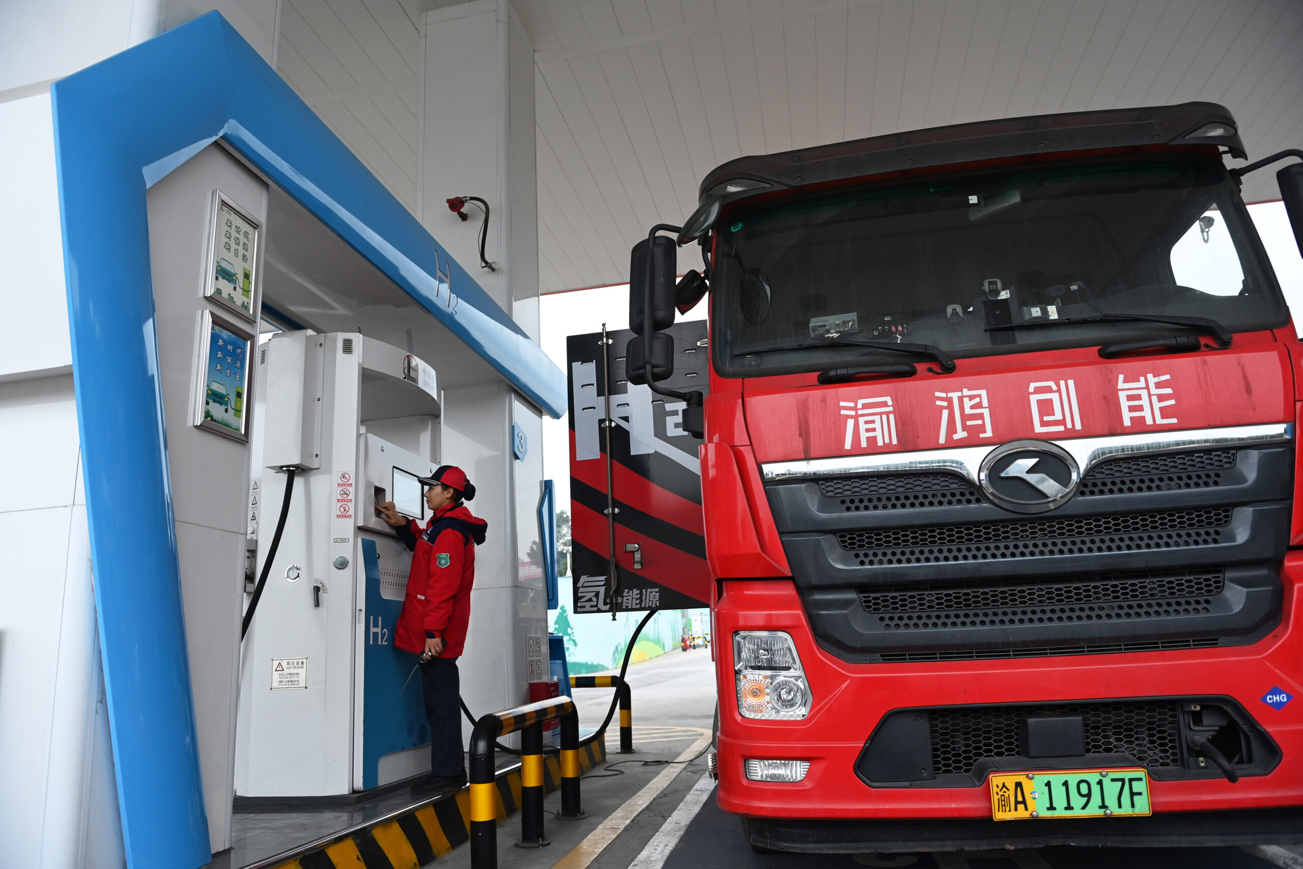 12月20日,中国石化3000标准立方米/小时氢燃料电池供氢加氢项目在重庆市长寿区建成投运。这是中国石化布局中国西南地区的首个供氢中心,也是中国首个天然气副产氢纯化供氢加氢一体化项目。图为重庆长寿加氢子站工作人员正在为车辆进行终端充装。