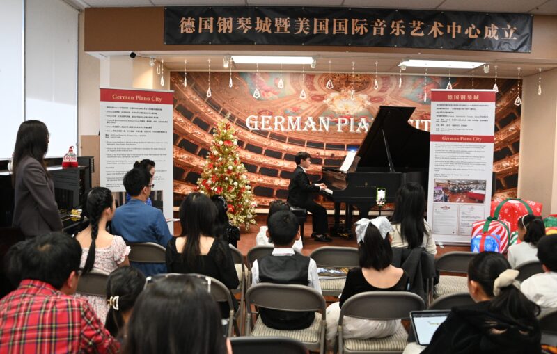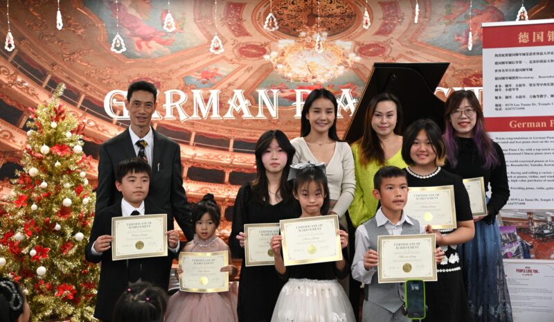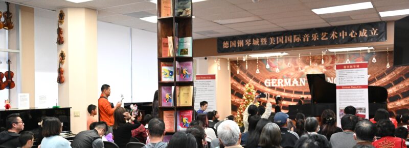 城市新闻12月17日天普市报导,悠扬的圣诞乐曲声中,小小钢琴家们欢聚在德国钢琴城(9579 Las Tunas Dr, Temple City, CA 91780)一起欣赏圣诞音乐演奏会,天普市市长文尚丞来到现场,对德国钢琴城总经理、高级调音师黄学文热心文化公益事业、致力于通过音乐教育和音乐技能的培训开发孩子智力、培养孩子们高尚情操的努力给予高度评价,文尚丞市长为黄学文颁发贺状表彰,并为美国国际音乐艺术中心揭牌,李嘉璧主持。