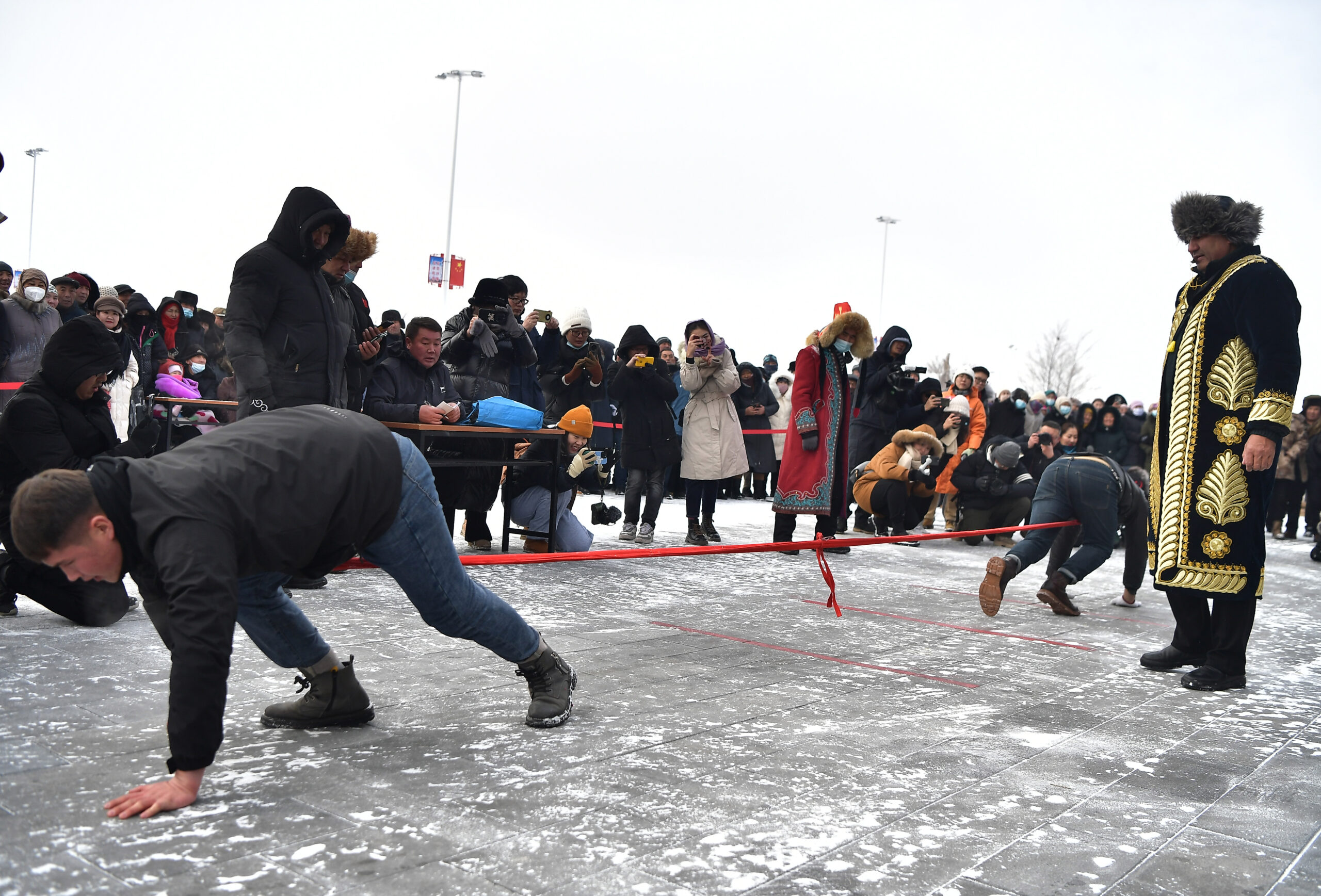 12月21日,中国唯一的乌孜别克族民族乡——新疆木垒县大南沟乌孜别克族乡举行冬宰节活动,吸引各方游客前来观赏文体节目、品尝传统美食。乌孜别克族乡以牛羊等牲畜为传统养殖,每年的第一场大雪后牧民会选择膘肥体壮的牲畜过冬宰节,储备冬肉。图为冬宰节上当地村民进行“押加”比赛。