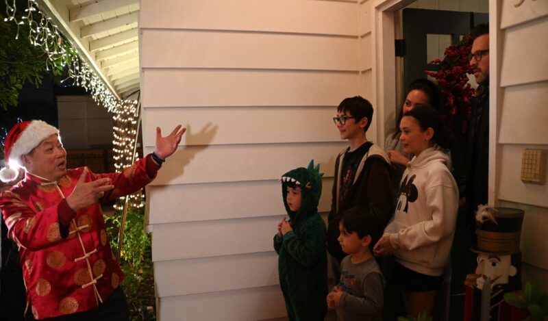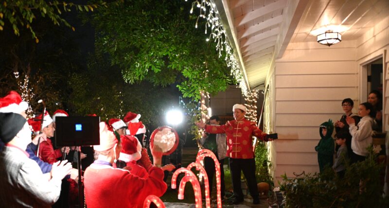 南加州中国国乐团演奏家们戴着红色圣诞帽,活似圣诞老人派来的「音乐天使」。指挥乔欣敲开一户人家的大门,当家门打开的剎那间,一家三代被眼前景象震住了,一声「Merry Christmas」话音刚落,「红帽子乐队」即奏起了「Jingle Bells」,「Deck The Halls」,「Frosty the Snowman」,「God Rest Ye Merry Gentleman」等乐曲,屋主连呼「surprise」,并开心地与乔欣合影留念。
