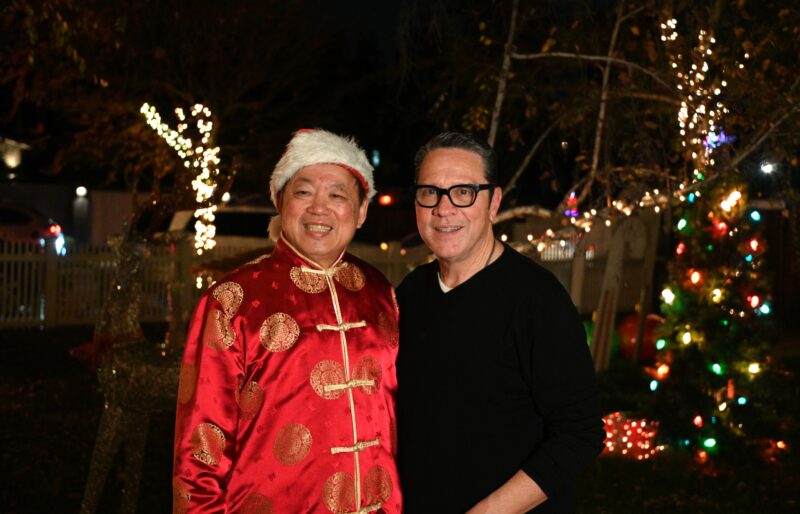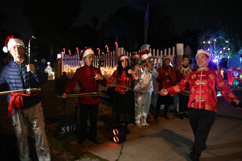 城市闻12月23日伍兰冈报导,圣诞节前夕,洛杉矶知名圣诞灯饰观光区Woodland Hills(伍兰冈)夜幕刚降临,圣诞灯饰观光区汽车巳排成长龙,缓缓前行。不少私家车打开天窗,孩子们一个个探出头来观看马路两旁的住家圣诞灯饰。让人们欣喜若狂的是马路边竟奏响中国民乐、二胡、笛子等演奏圣诞歌曲和中国歌曲,伍兰冈圣诞灯饰观光区顿时欢腾起来,惊喜连连,「Merry Christmas」声浪四起,圣诞氛围更浓郁。