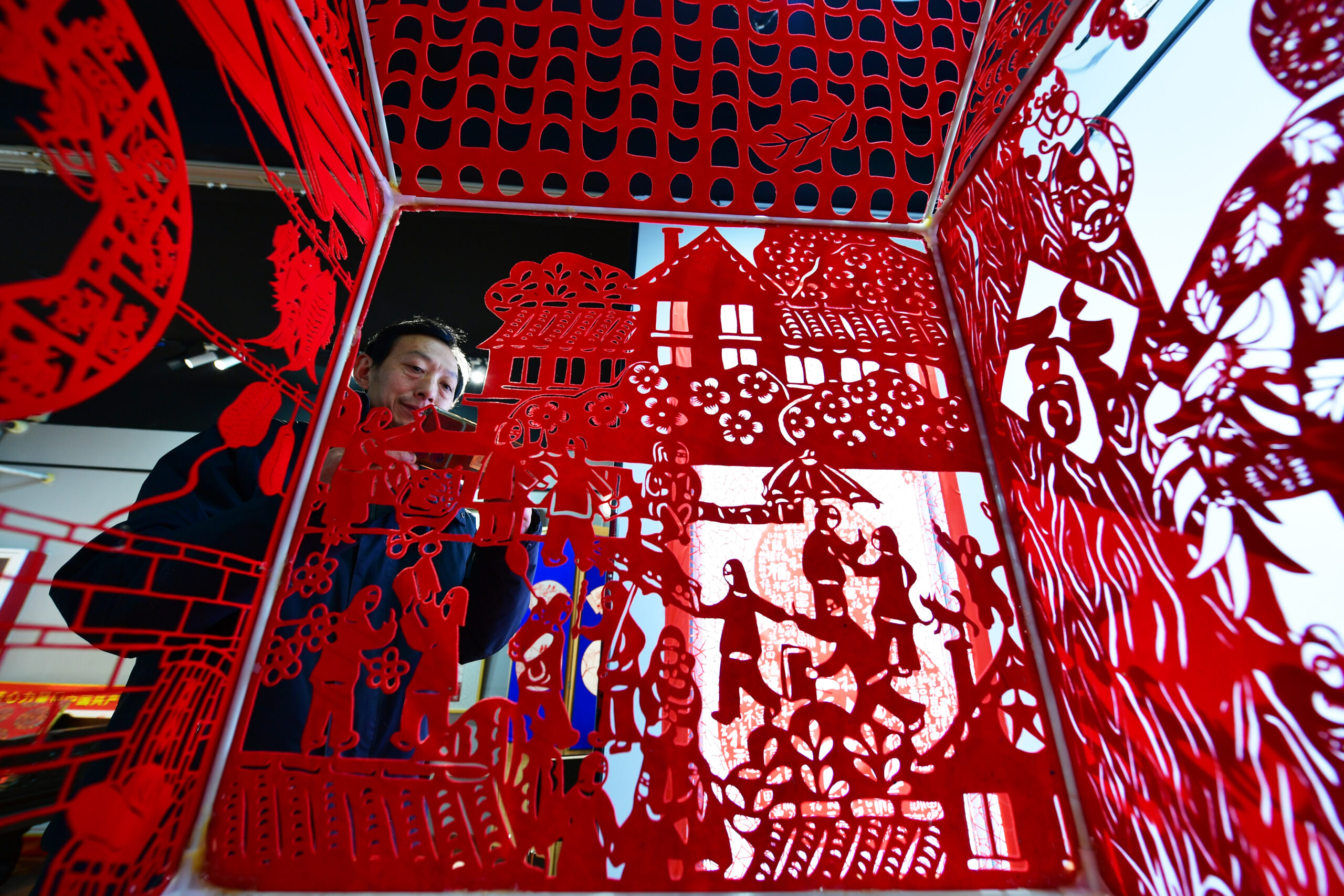 12月28日,河北省衡水市阜城县一家剪纸工作室,参观者观看剪纸作品《老家》。据了解,阜城剪纸至今已有200多年历史,2016年被列入河北省省级非物质文化遗产名录。该技艺具有阴阳相间、线条流畅、色彩单纯、形象鲜明、刀工巧妙等艺术风格,它以传统的中国绘画为基础,材料有丝绸、布匹、绢纸、宣纸等。如今,阜城剪纸作品不仅畅销北京、天津、东北三省,还远销新加坡、韩国等28个国家和地区。