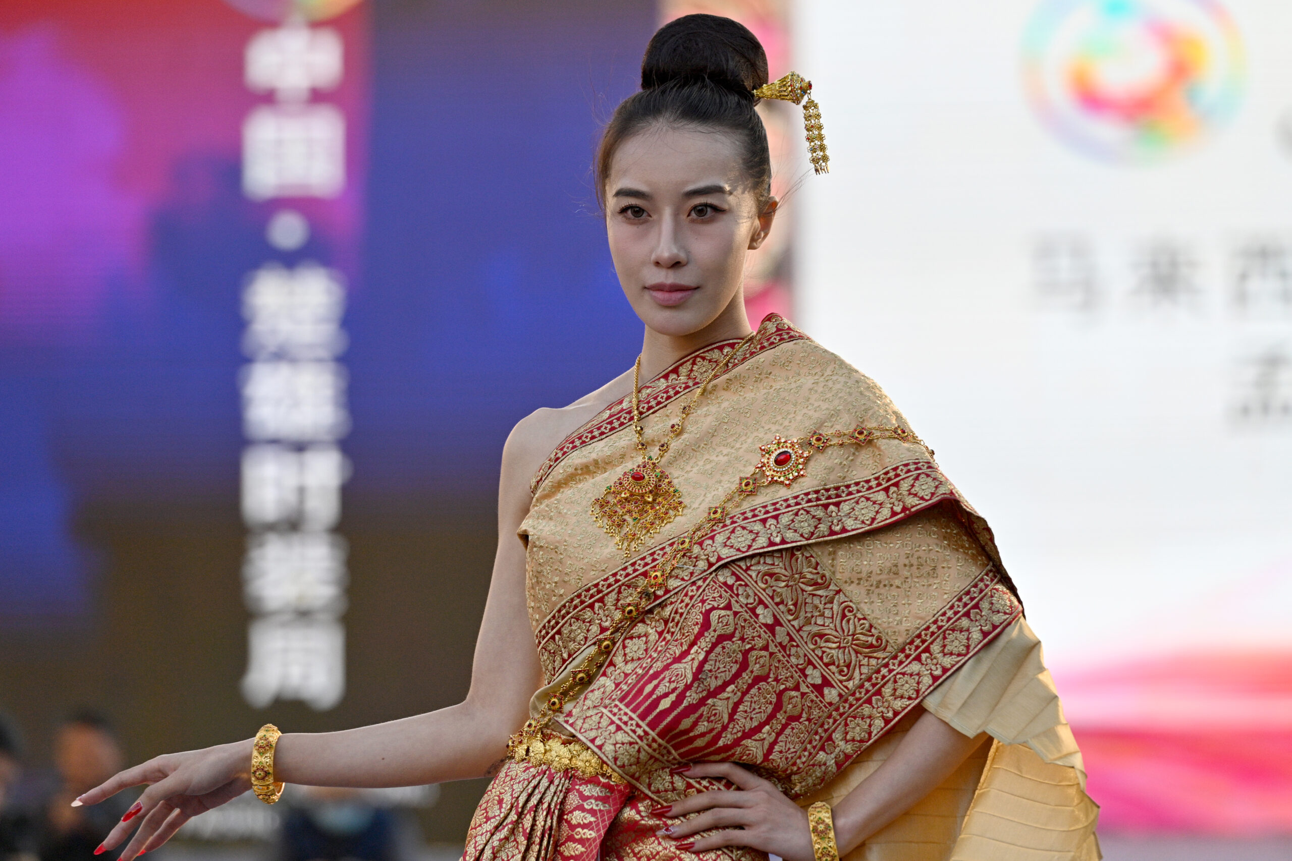 1月4日,云南楚雄,模特身着泰国民族服饰走秀。当日,来自马来西亚、老挝、缅甸、柬埔寨、孟加拉国、越南、泰国的民族服饰亮相楚雄时装周“南亚东南亚民族服饰专场发布”走秀。
