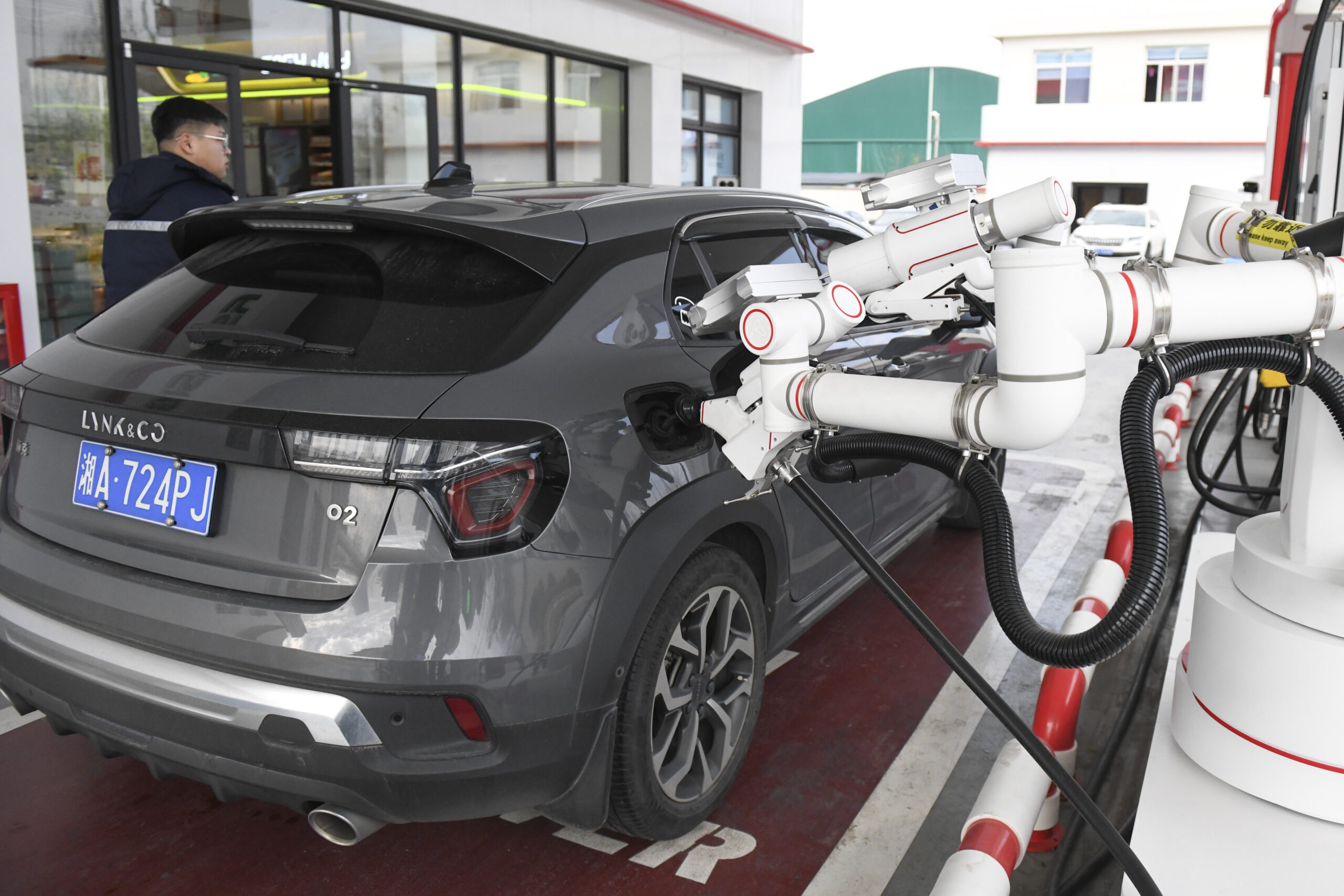 1月4日,加油机器人为汽车加油。近期,长沙一加油站推出的加油机器人服务吸引了不少客人前来光顾。在APP预约下单后,驾驶员只需要将车辆停至指定区域,加油机器人搭载的机械手臂就会通过视觉识别技术定位车辆油箱盖,并自主完成开盖、加油、关盖等一系列操作,实现无人全自动加油。