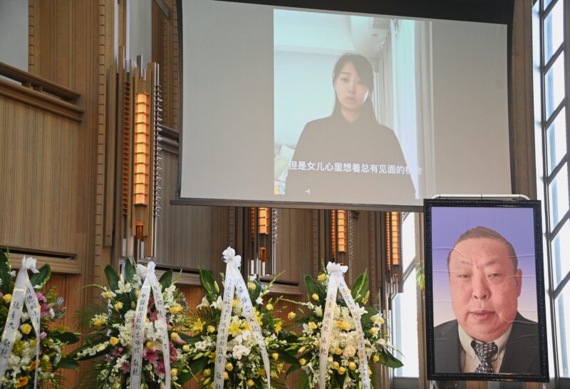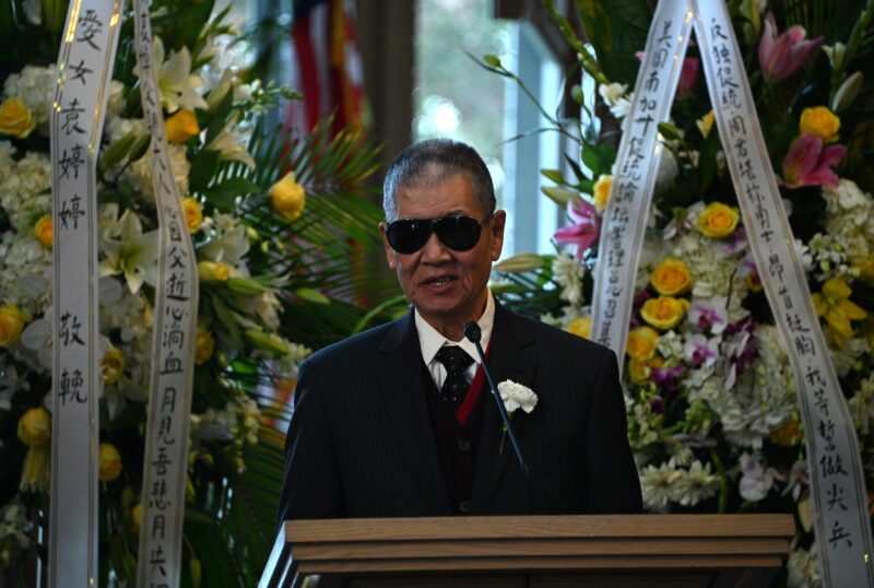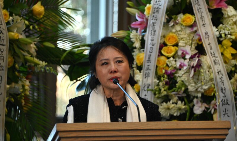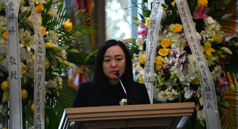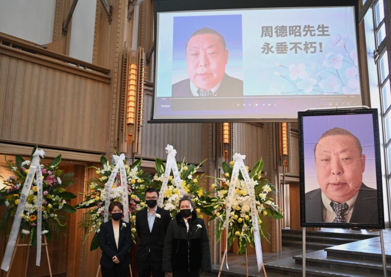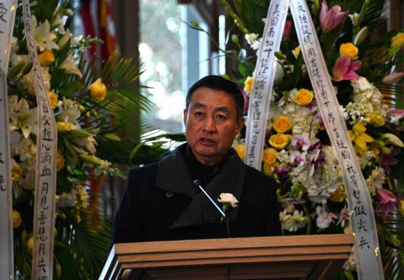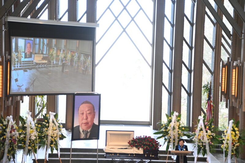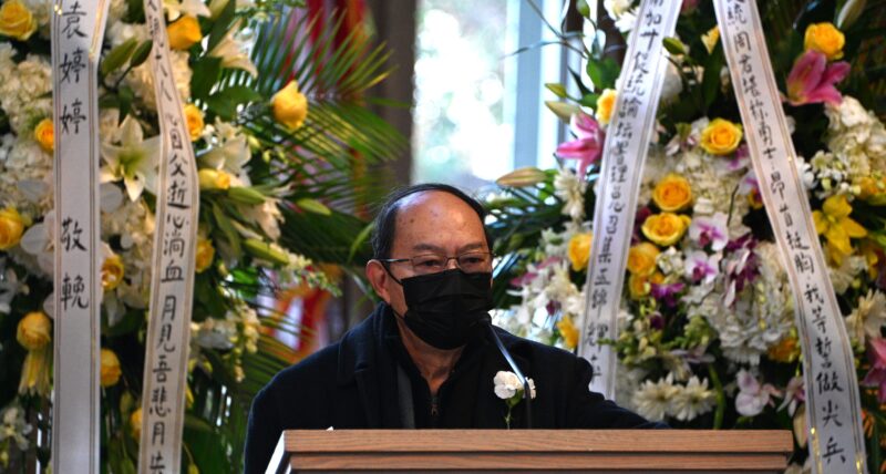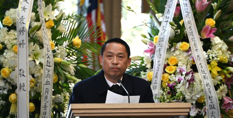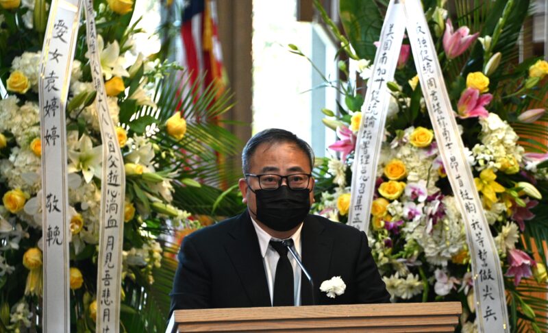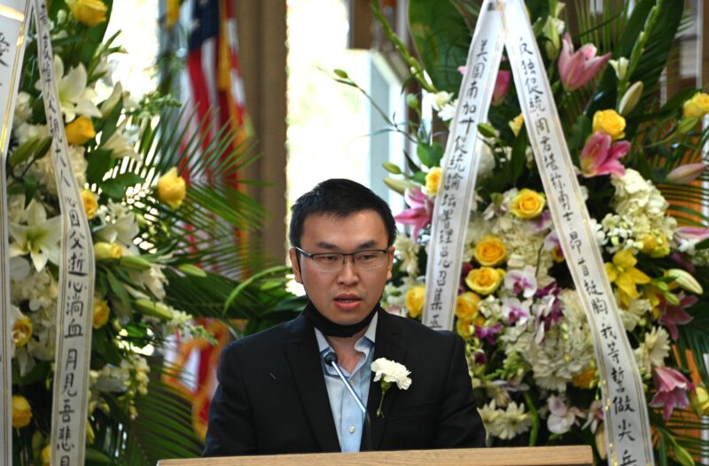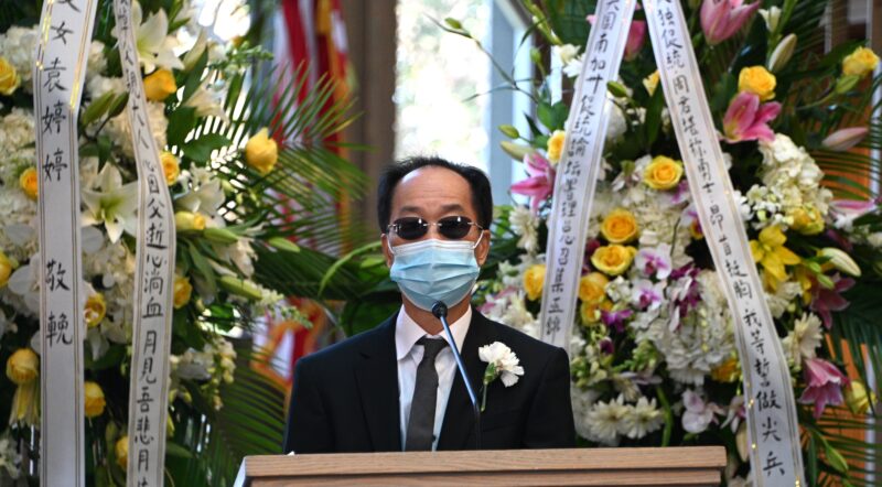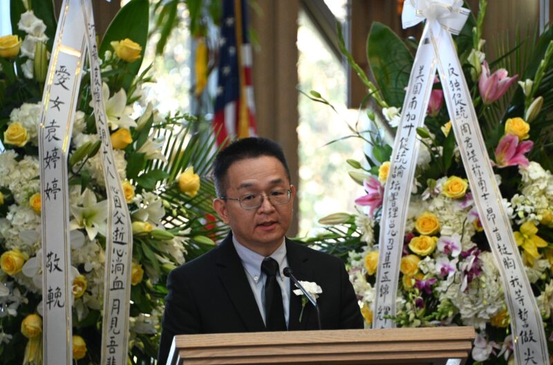 周德昭先生的儿子周俊毅代表家属致答谢词。他代表家属感谢中国驻洛杉矶总领馆的关怀与支持,感谢南加州各大侨团和父亲生前的好友为父亲举办这么隆重的追悼会和葬礼。他表示,一定不会辜负父亲的希望,照顾好妈妈、发展好自己的事业、培养好自己的孩子,让父亲安息。周德昭在四川的女儿袁婷婷因签证问题无法前来参加葬礼,通过视频发来对父亲的缅怀。朴实的话语、真挚的情感,表达了对父亲的无尽思念和未能见面的遗憾,令人泪目。